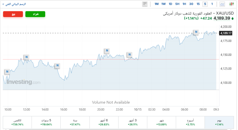 وقد سجل سعر أونصة الذهب العالمي، رتفاعًا ملحوظًا بنسبة 1.1%، ليتداول الآن عند 4,189 دولار، بعدما وصل أدنى مستوى عند 4,140 دولارًا للأونصة، وأعلى مستوى عند 4,193، وفقًا لتقرير «إنفيستينج»، فيما صعدت عقود الذهب الآجلة تسليم ديسمبر بنسبة 1.02%، لتسجل نحو 4,205.70 دولارًا للأوقية، بعد أن افتتحت تداولات اليوم عند المستوى 4,160.10 دولار للأوقية، وفقًا لـ«ياهو فايننس».