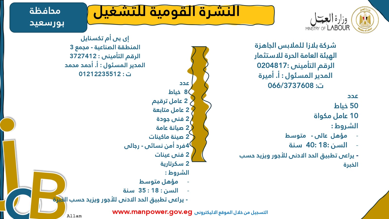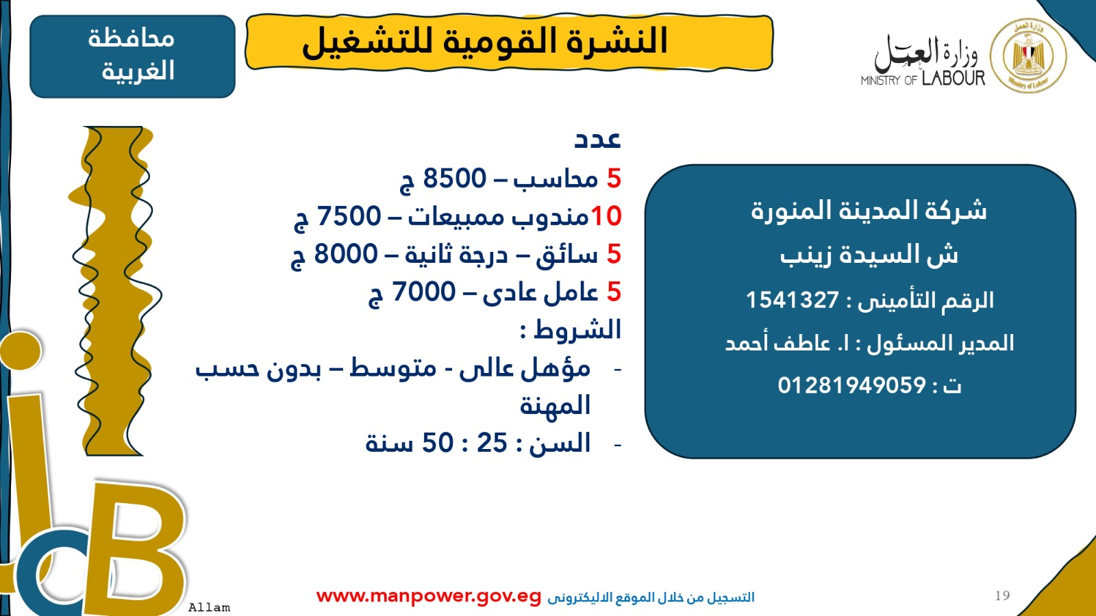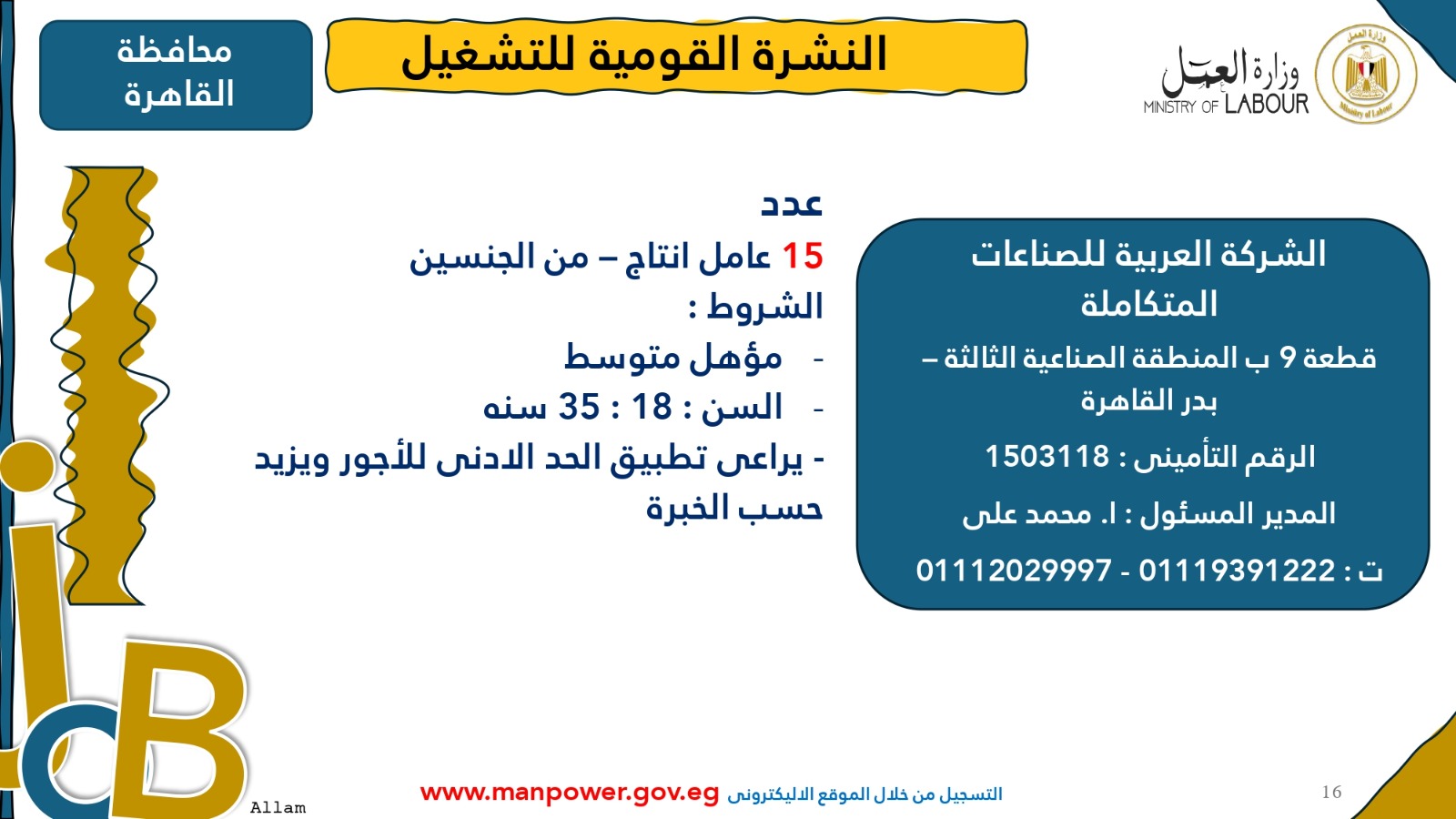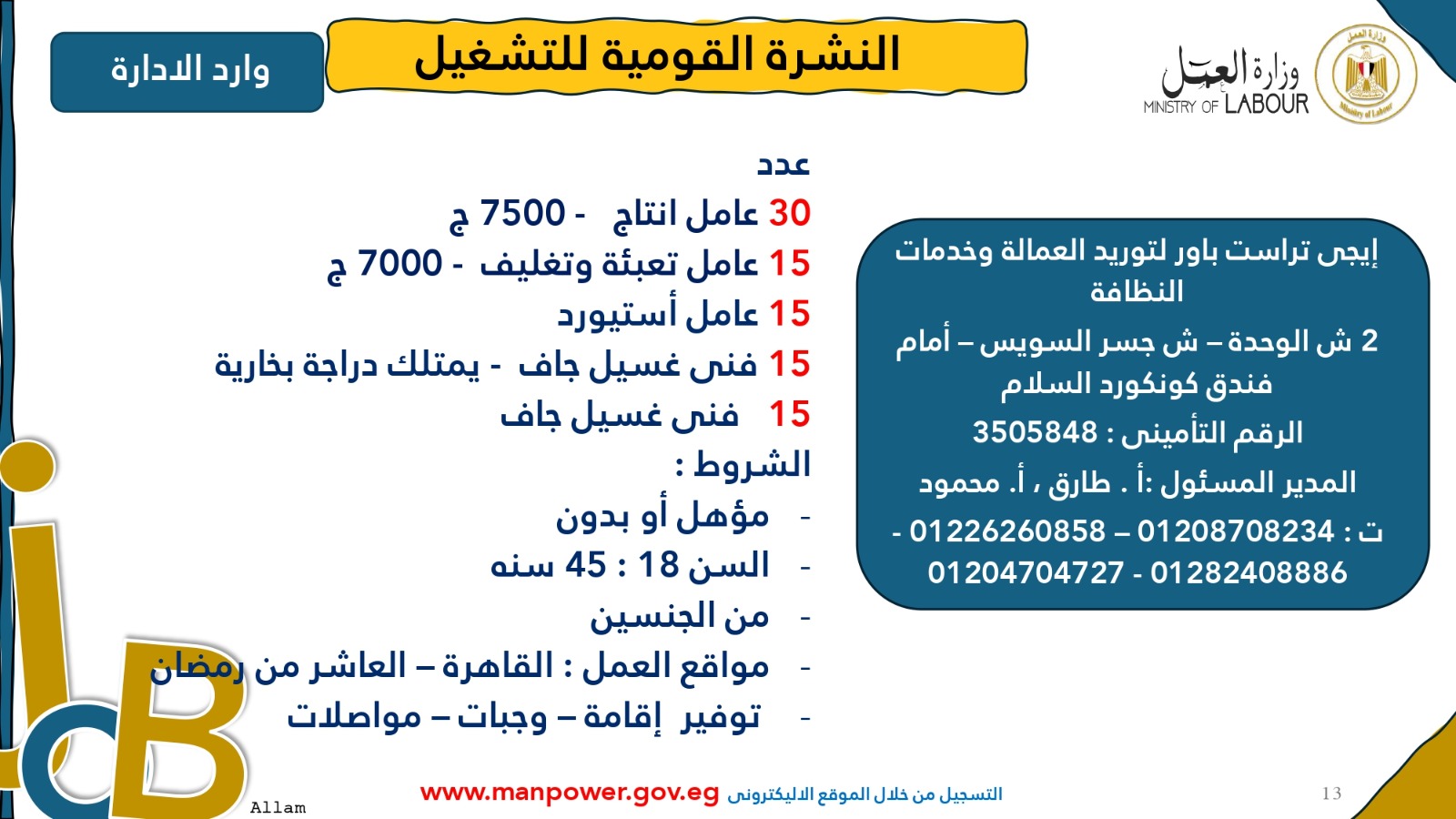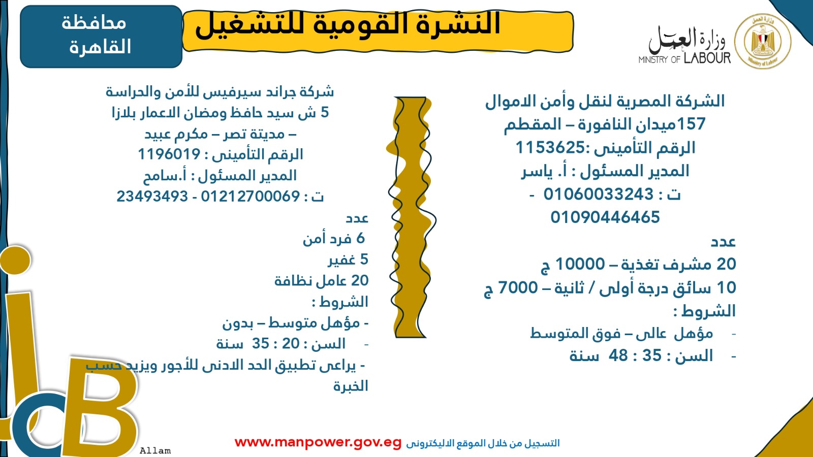 وأوضحت الوزارة أن التقديم متاح خلال شهري أكتوبر ونوفمبر 2025، من خلال مكتب الإدارة العامة للتشغيل بمقر الوزارة القديم في مدينة نصر، أو عبر مديريات العمل بالمحافظات، أو من خلال أرقام وعناوين الشركات المرفقة بالبيان، وكذلك عبر الموقع الرسمي لوزارة العمل على شبكة الإنترنت.