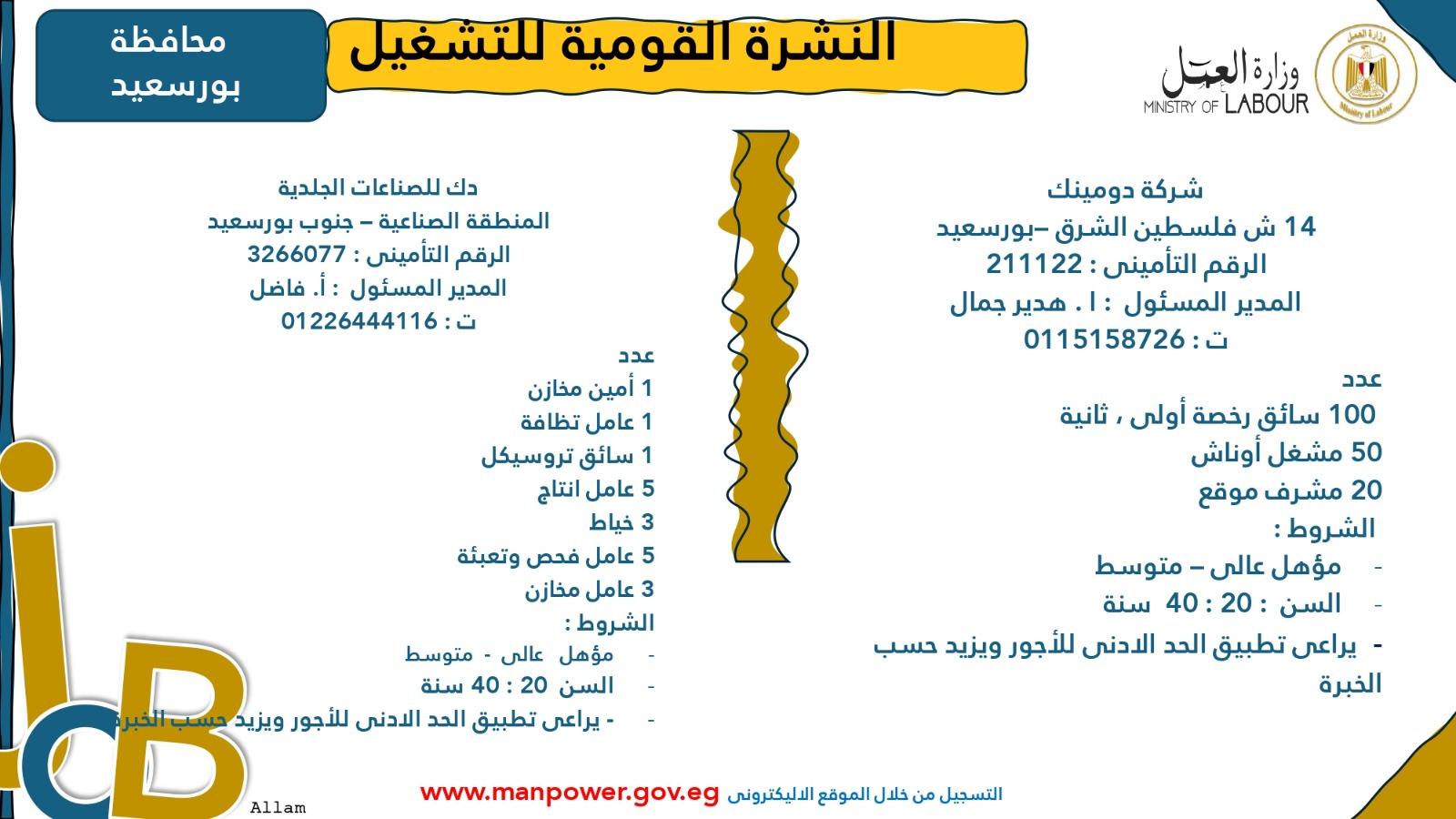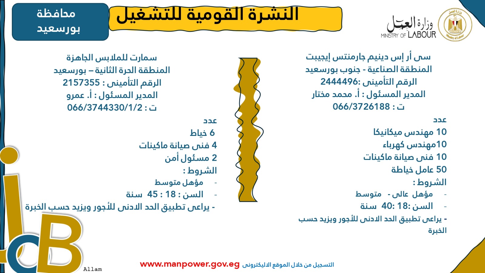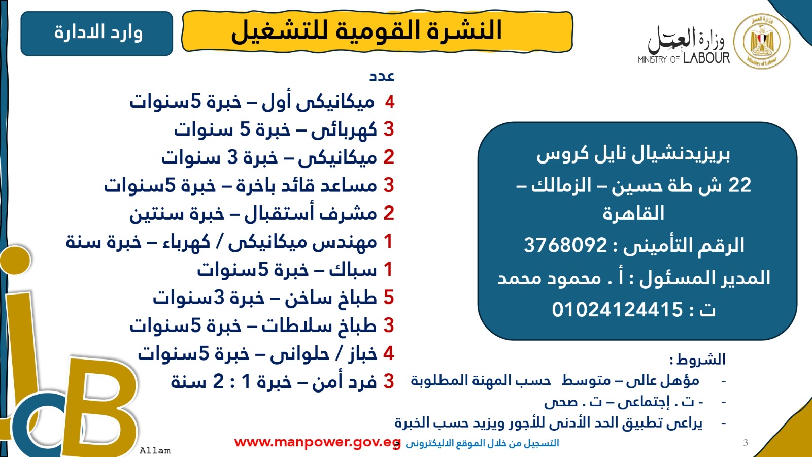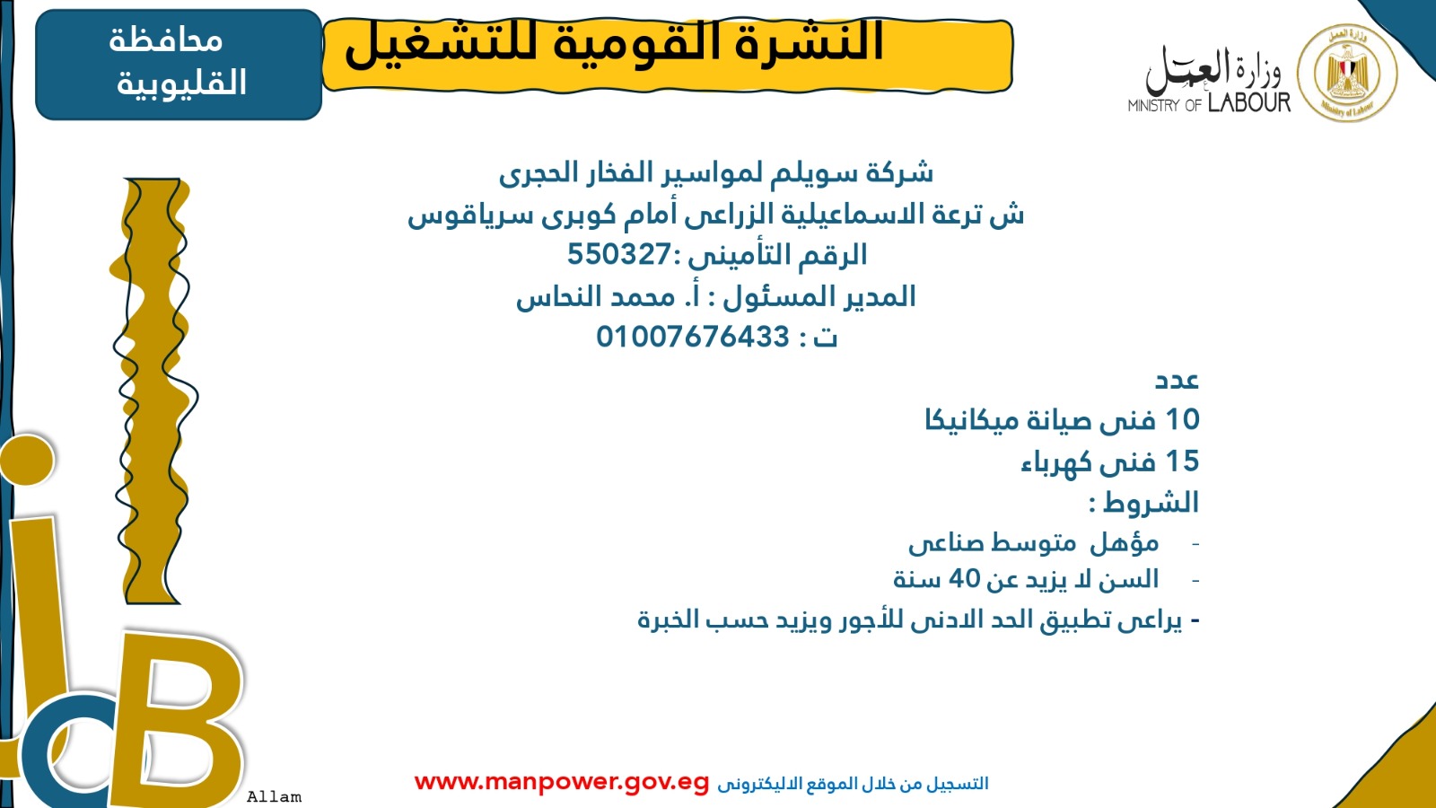 وأوضحت الوزارة أن التقديم متاح خلال شهري أكتوبر ونوفمبر 2025، من خلال مكتب الإدارة العامة للتشغيل بمقر الوزارة القديم في مدينة نصر، أو عبر مديريات العمل بالمحافظات، أو من خلال أرقام وعناوين الشركات المرفقة بالبيان، وكذلك عبر الموقع الرسمي لوزارة العمل على شبكة الإنترنت.
