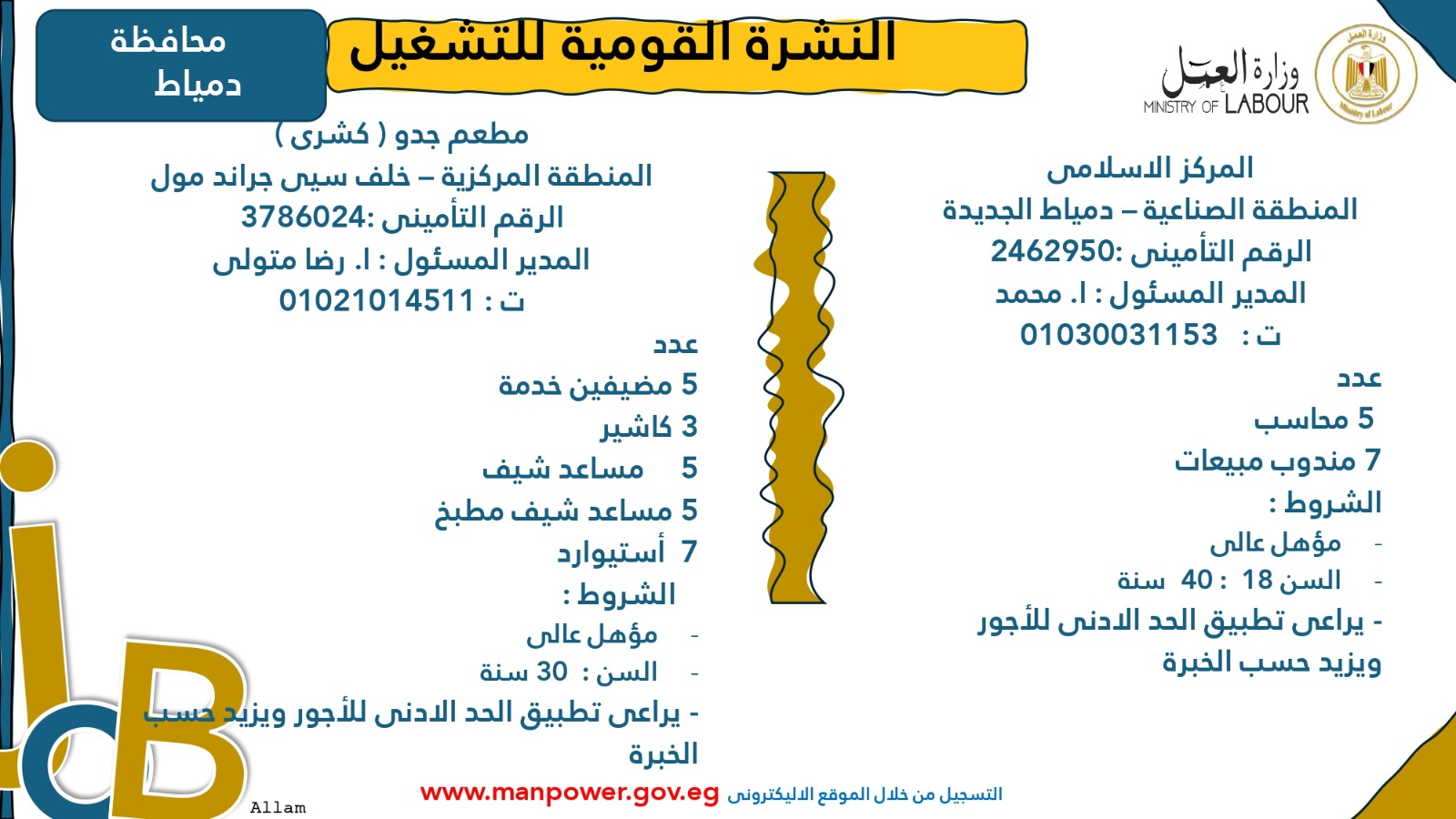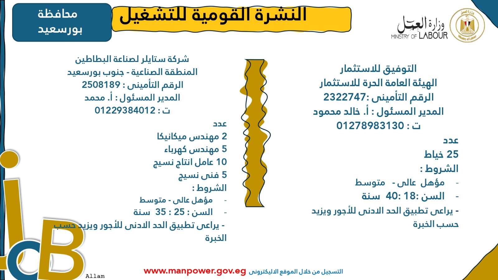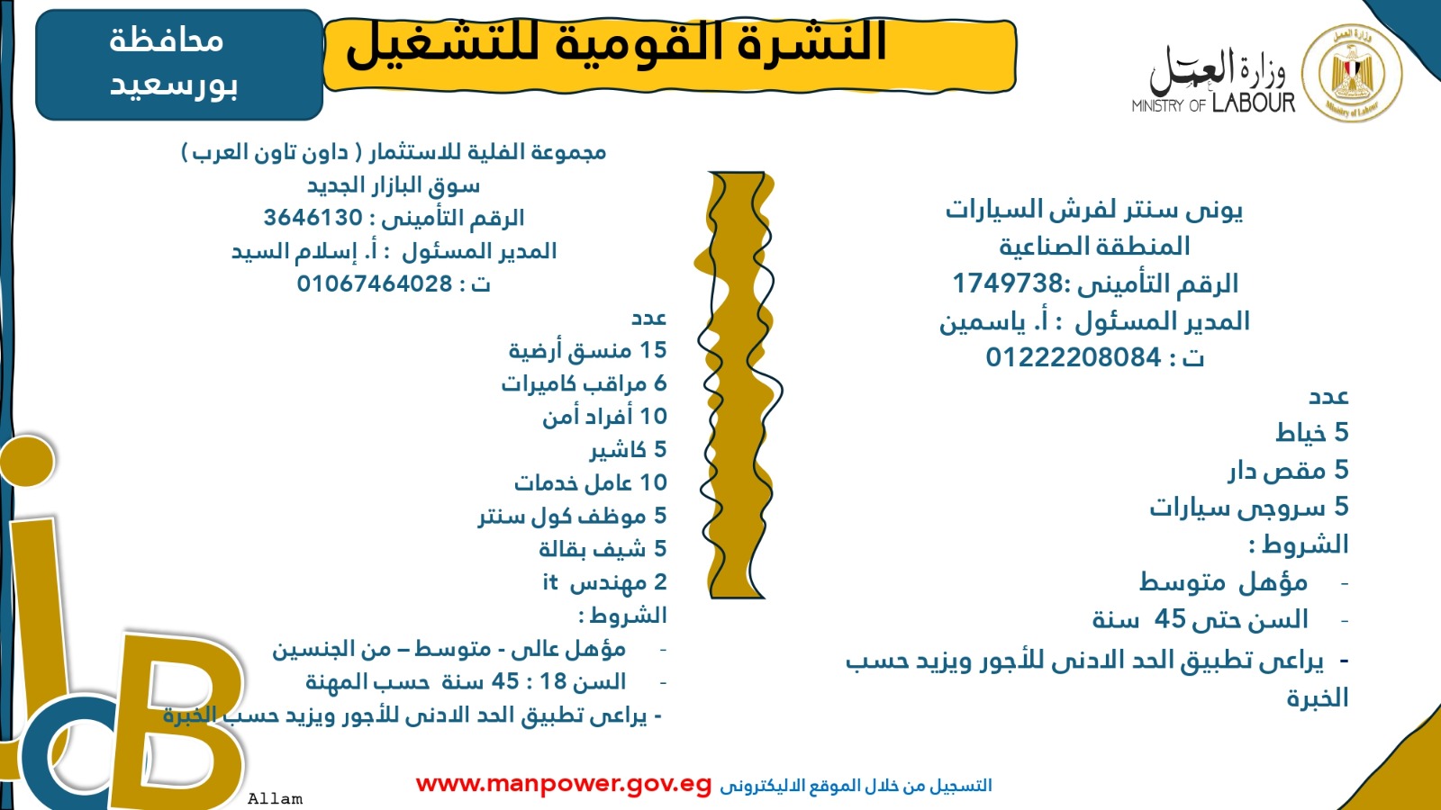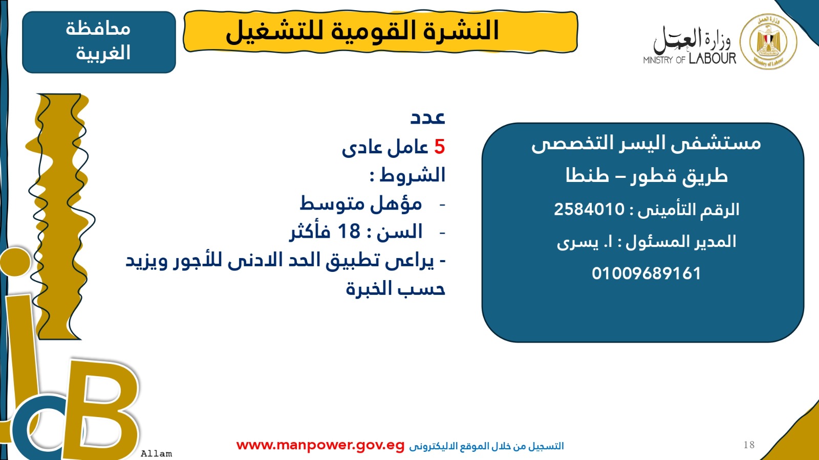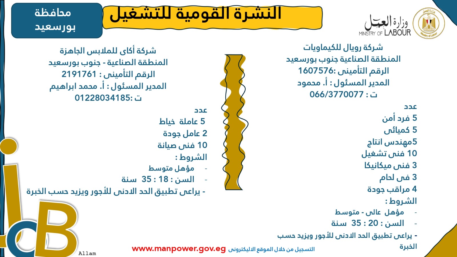 وأوضحت الوزارة أن التقديم متاح خلال شهري أكتوبر ونوفمبر 2025، من خلال مكتب الإدارة العامة للتشغيل بمقر الوزارة القديم في مدينة نصر، أو عبر مديريات العمل بالمحافظات، أو من خلال أرقام وعناوين الشركات المرفقة بالبيان، وكذلك عبر الموقع الرسمي لوزارة العمل على شبكة الإنترنت.