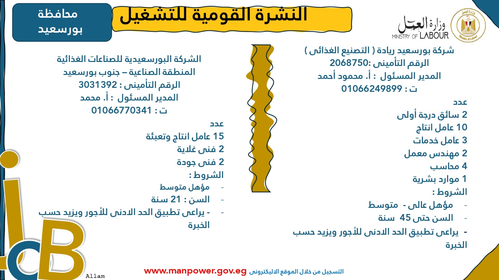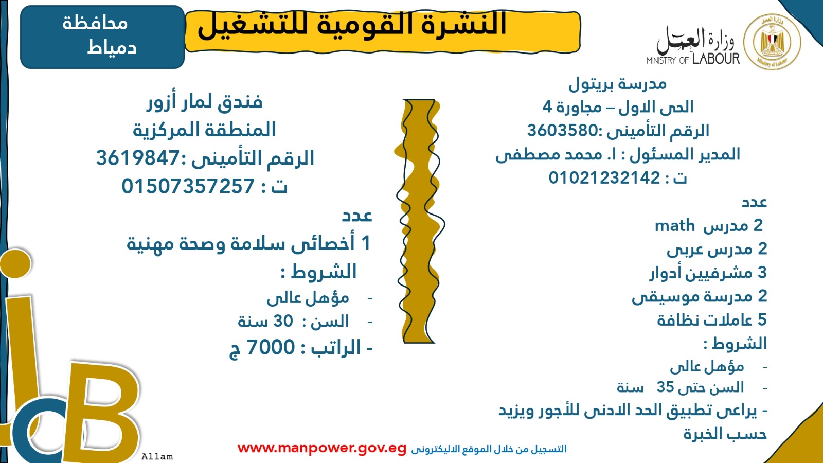 وجدد محمد جبران، وزير العمل، دعوته لشباب مصر إلى الإقبال على العمل في القطاع الخاص، والاستفادة من الخدمات التي تقدمها الدولة المصرية، ومن بينها برامج التدريب المهني المجانية التي تؤهل الشباب للمهن المطلوبة في سوق العمل، وكذلك الوظائف المعلنة في نشرة التوظيف نصف الشهرية التي توفر فرص عمل متنوعة في القطاع الخاص.