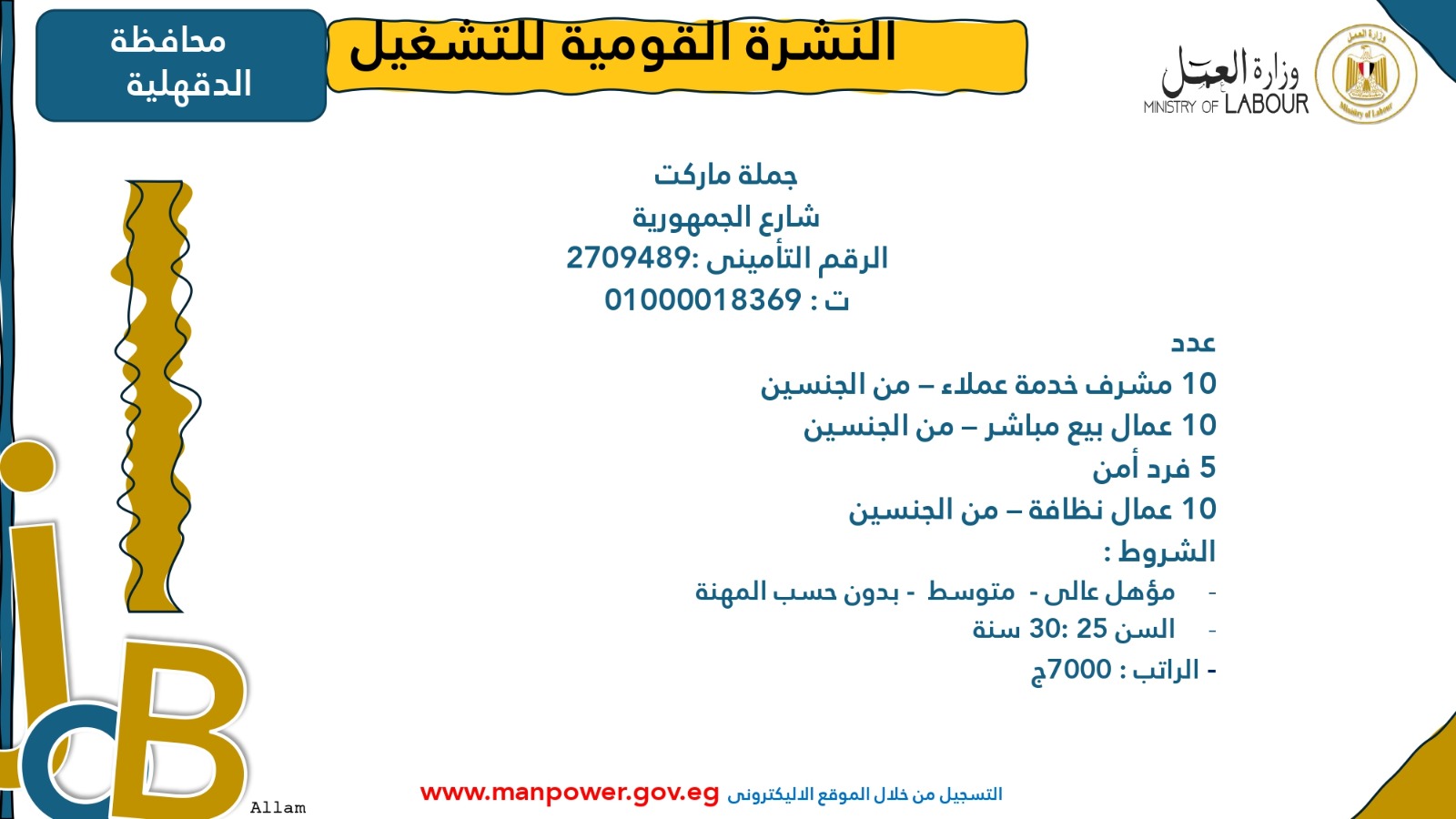 وقالت الوزارة في بيانها، إنها تلقت طلبات من 72 شركة قطاع خاص في 13 محافظة لتوفير 2914 وظيفة في عدد من التخصصات، من بينها وظائف مخصصة لأصحاب الهمم، وذلك برواتب مجزية تُحدد وفق المقابلة الشخصية، وبما لا يقل عن الحد الأدنى للأجور، بالإضافة إلى التأمين الصحي والاجتماعي.