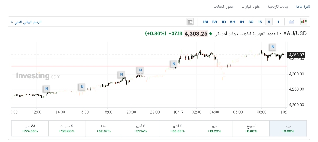 واصل الذهب ارتفاعه اليوم الجمعة متجاوزًا مستوى 4300 دولار، متجهًا لتحقيق مكاسب للأسبوع التاسع على التوالي، في طريقه لتحقيق أفضل أداء أسبوعي له منذ 17 عامًا، حيث ضاعف تصاعد التوتر التجاري بين الولايات المتحدة والصين حالة عدم اليقين في السوق، وعززت الآمال في خفض أسعار الفائدة الأمريكية مكاسب المعدن الأصفر.