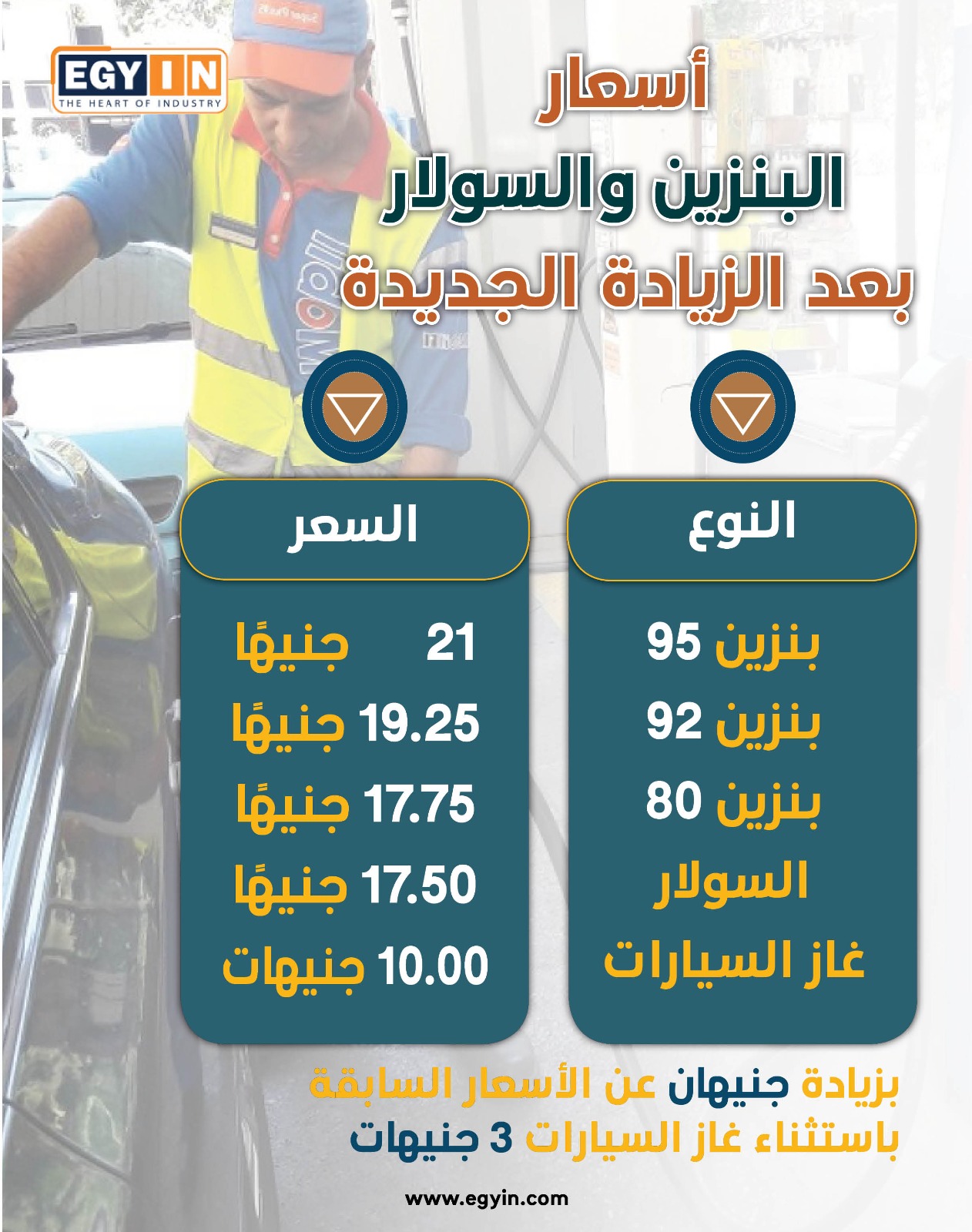 بنزين 95: 21 جنيهًا / لتر بدلًا من 19 جنيهًا.