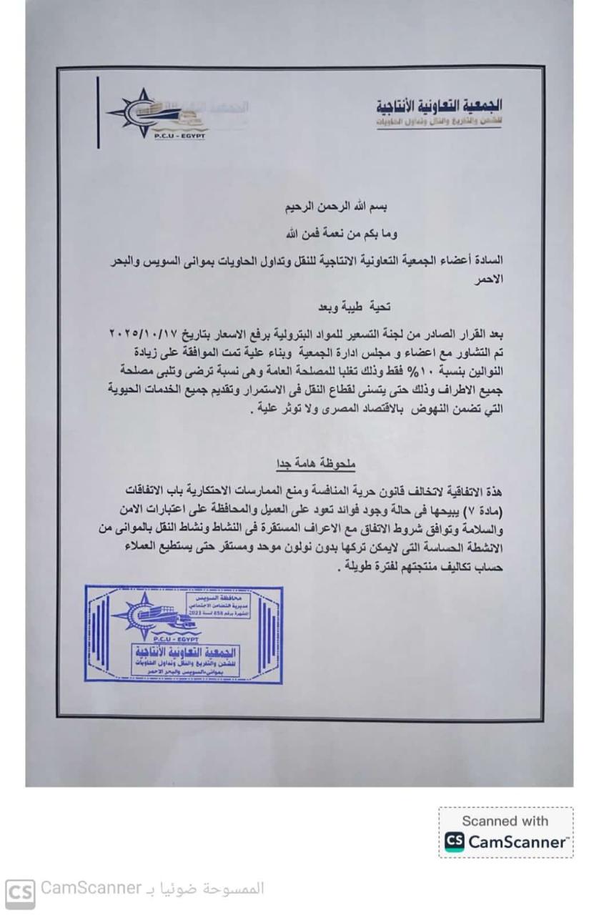 أعلنت الجمعية التعاونية الإنتاجية للنقل وتداول الحاويات بموانئ السويس والبحر الأحمر عن رفع النوالين بنسبة 10%، وذلك في أعقاب قرار لجنة تسعير المواد البترولية بزيادة أسعار الوقود.