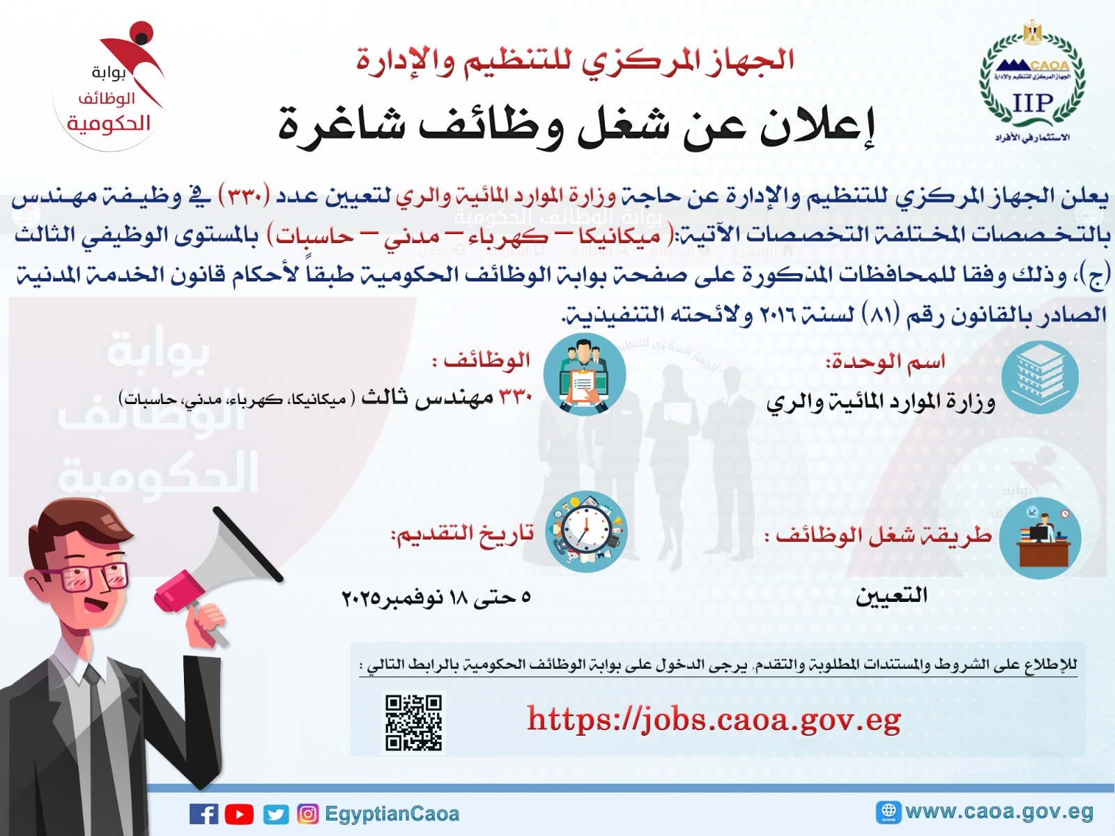 أعلن الجهاز المركزي للتنظيم والإدارة عن حاجة وزارة الموارد المائية والري لتعيين عدد (330) في وظيفة مهندس بالتخصصات المختلفة التخصصات الآتية: ( ميكانيكا – كهرباء - مدني - حاسبات ) بالمستوى الوظيفي الثالث (ج)، وذلك وفقا للمحافظات المذكورة على صفحة بوابة الوظائف الحكومية طبقًا لأحكام قانون الخدمة المدنية الصادر بالقانون رقم (81) لسنة2016 ولائحته التنفيذية.