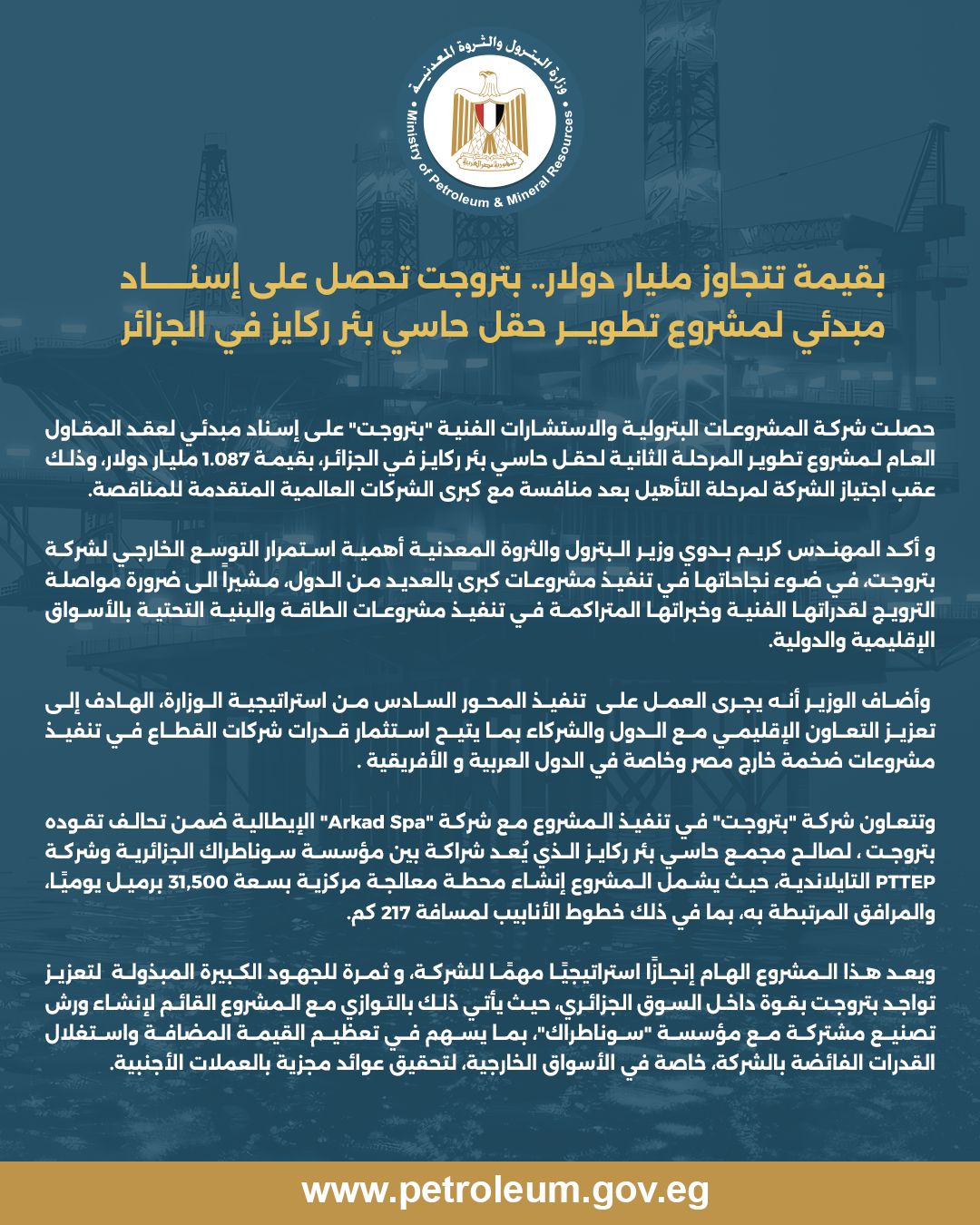 حصلت شركة المشروعات البترولية والاستشارات الفنية "بتروجت" على إسناد مبدئي لعقد المقاول العام لمشروع تطوير المرحلة الثانية لحقل حاسي بئر ركايز في الجزائر، بقيمة 1.087 مليار دولار، وذلك عقب اجتياز الشركة لمرحلة التأهيل بعد منافسة مع كبرى الشركات العالمية المتقدمة للمناقصة.