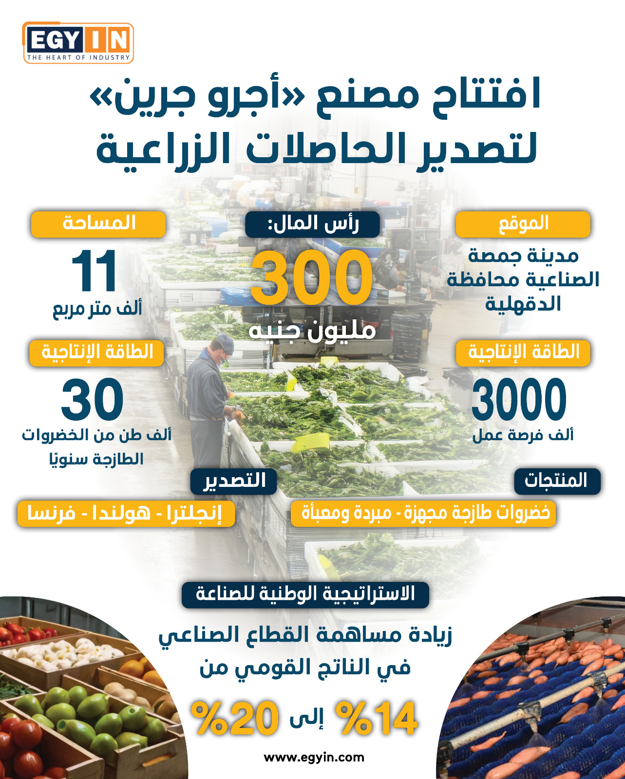 3 آلاف فرصة عمل، تفاصيل مصنع "أجرو جرين" لتصدير الحاصلات الزراعية (إنفوجراف)