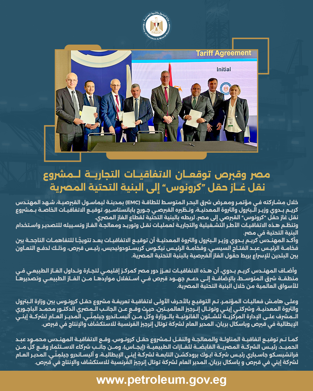 شهد المهندس كريم بدوي وزير البترول والثروة المعدنية، ونظيره القبرصي جورج بابانستاسيو، توقيع الاتفاقيات الخاصة بمشروع نقل غاز حقل "كرونوس" القبرصي إلى مصر، لربطه بالبنية التحتية لقطاع الغاز المصري، وتنظم تلك الاتفاقيات، الأطر التشغيلية والتجارية لعمليات نقل وتوريد ومعالجة الغاز وتسييله للتصدير واستخدام البنية التحتية في مصر.