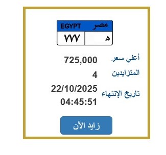 أعلنت بوابة مرور مصر الإلكترونية عن طرح لوحة سيارة مميزة تحمل أرقام وحروف «ه 777» في مزاد علني لأعلى سعر، حيث يتنافس على اقتنائها حتى الآن 4 متقدمين.