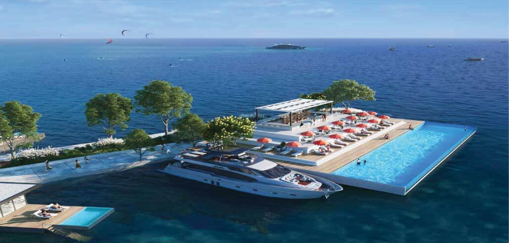 وبالإضافة إلى ذلك، يضم المشروع أرصفة بحرية بطول 400 متر، وقنوات مائية صالحة للملاحة تمتد في قلب المشروع، وتوفر "مراسي البحر الأحمر" مرسي خاص للفيلات، وشاطئ "إنفينيتي" مرتفع بطول 1.5 كم وارتفاع 10 أمتار.