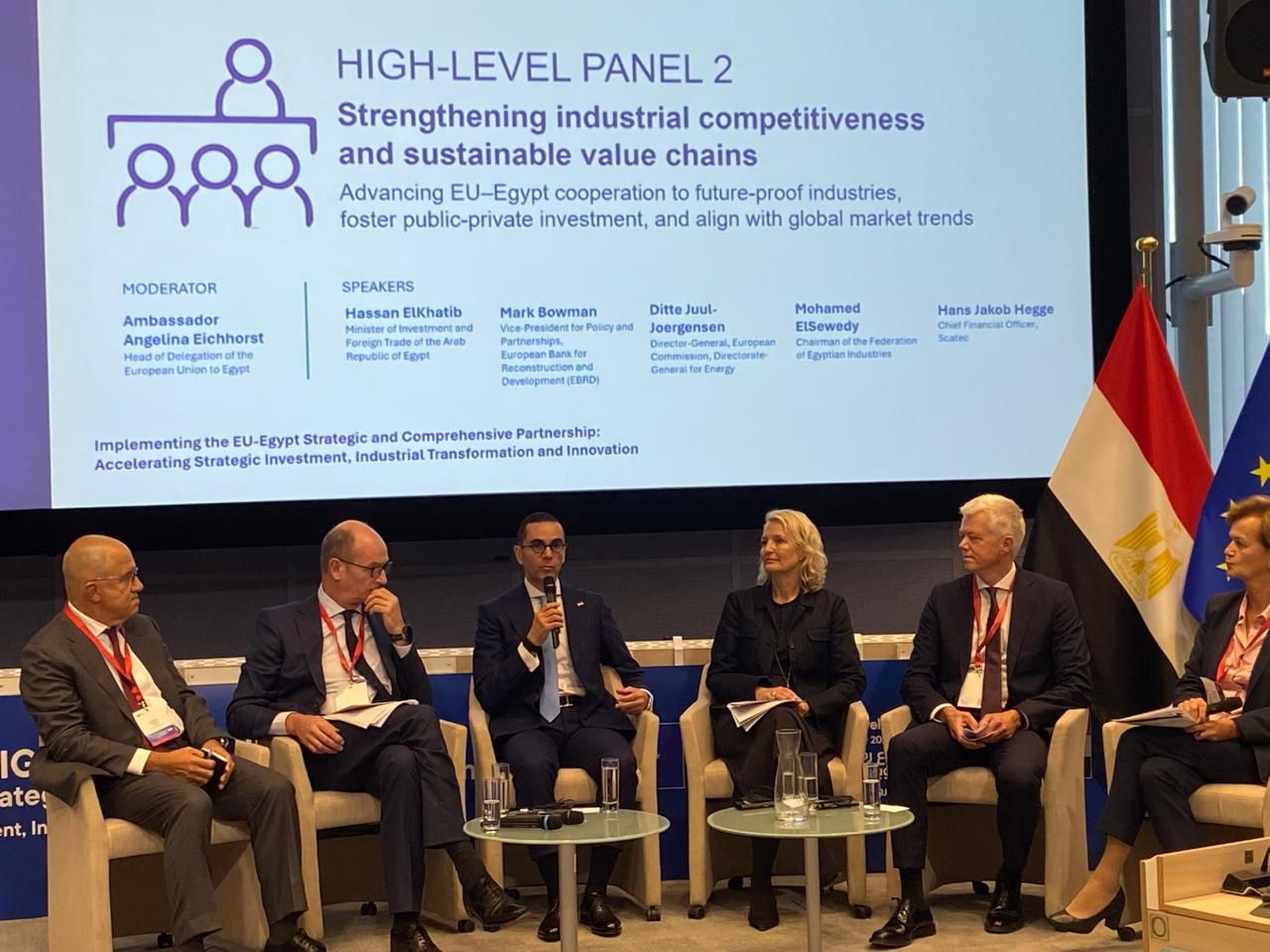 فى إطار فعاليات القمة المصرية الأوروبية المنعقدة فى بروكسل، شارك المهندس حسن الخطيب وزير الإستثمار والتجارة الخارجيه فى الجلسة الثانية رفيعة المستوى بعنوان "تعزيز القدرة التنافسية الصناعية وسلاسل القيمة المستدامة: دفع التعاون المصري الأوروبي نحو صناعات مستقبلية مستدامة وجذب الاستثمارات العامة والخاصة"، وأدارت الجلسة أنجلينا إيتشهورست، سفيرة الاتحاد الأوروبي ورئيسة بعثة الاتحاد إلى مصر، بمشاركة مارك بومان، نائب رئيس البنك الأوروبي لإعادة الإعمار والتنمية (EBRD)، وديت يويل-يورجنسن، المدير العام للطاقة بالمفوضية الأوروبية، والمهندس محمد السويدي، رئيس اتحاد الصناعات المصرية، والسيد هانس جاكوب هيجه، المدير المالي لشركة SCATEC.