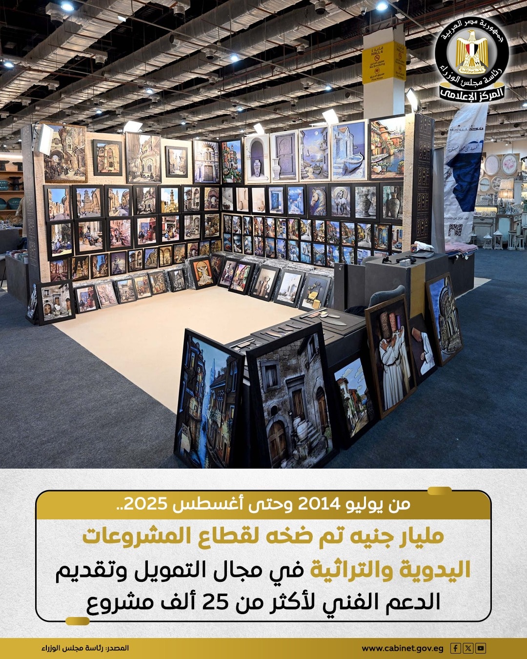 ولفت المركز إلى أن جهاز تنمية المشروعات المتوسطة والصغيرة ومتناهية الصغر نجح منذ يوليو 2014 وحتى أغسطس 2025 في ضخ حوالي مليار جنيه لقطاع المشروعات اليدوية والتراثية في مجال التمويل وتقديم الدعم الفني لأكثر من 25 ألف مشروع صغير ومتناهي الصغر، مما وفر وحافظ على استدامة حوالي 80 ألف فرصة عمل.