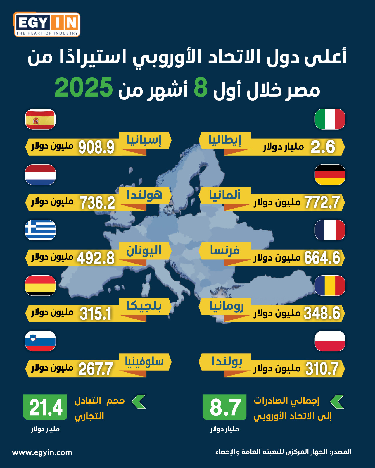 أعلى دول الاتحاد الأوروبي استيرادًا من مصر خلال أول 8 أشهر من 2025 (إنفوجراف)