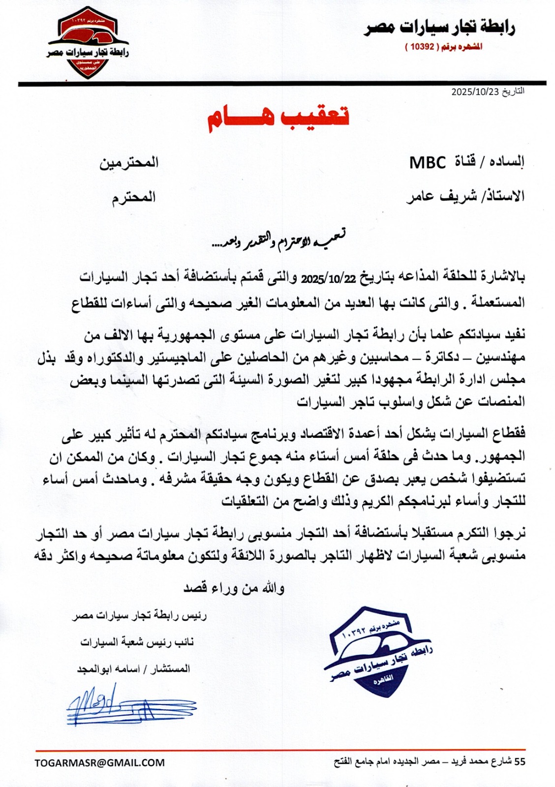 أعربت رابطة تجار سيارات مصر عن استيائها من الحلقة التي تم بثها على قناة MBC مصر بتاريخ 22 أكتوبر 2025 من برنامج «يحدث في مصر»، والتي استضافت أحد تجار السيارات المستعملة، معتبرة أن الحلقة تضمنت العديد من المعلومات غير الدقيقة التي أساءت إلى سمعة قطاع تجارة السيارات في مصر.