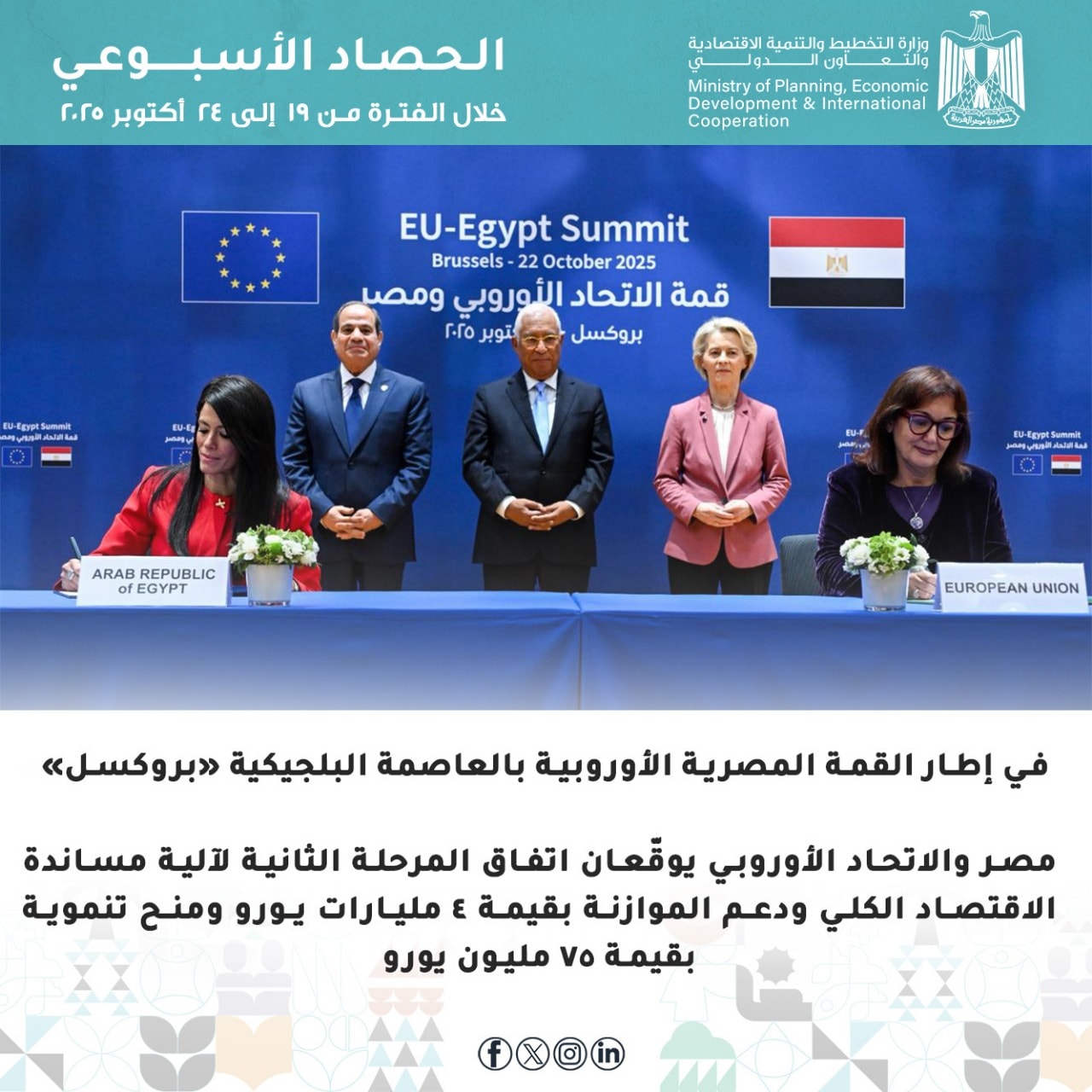 أنشطة وزارة التخطيط في أسبوع، مصر والاتحاد الأوروبي يوقعان مذكرة تعاون بـ4 مليارات يورو