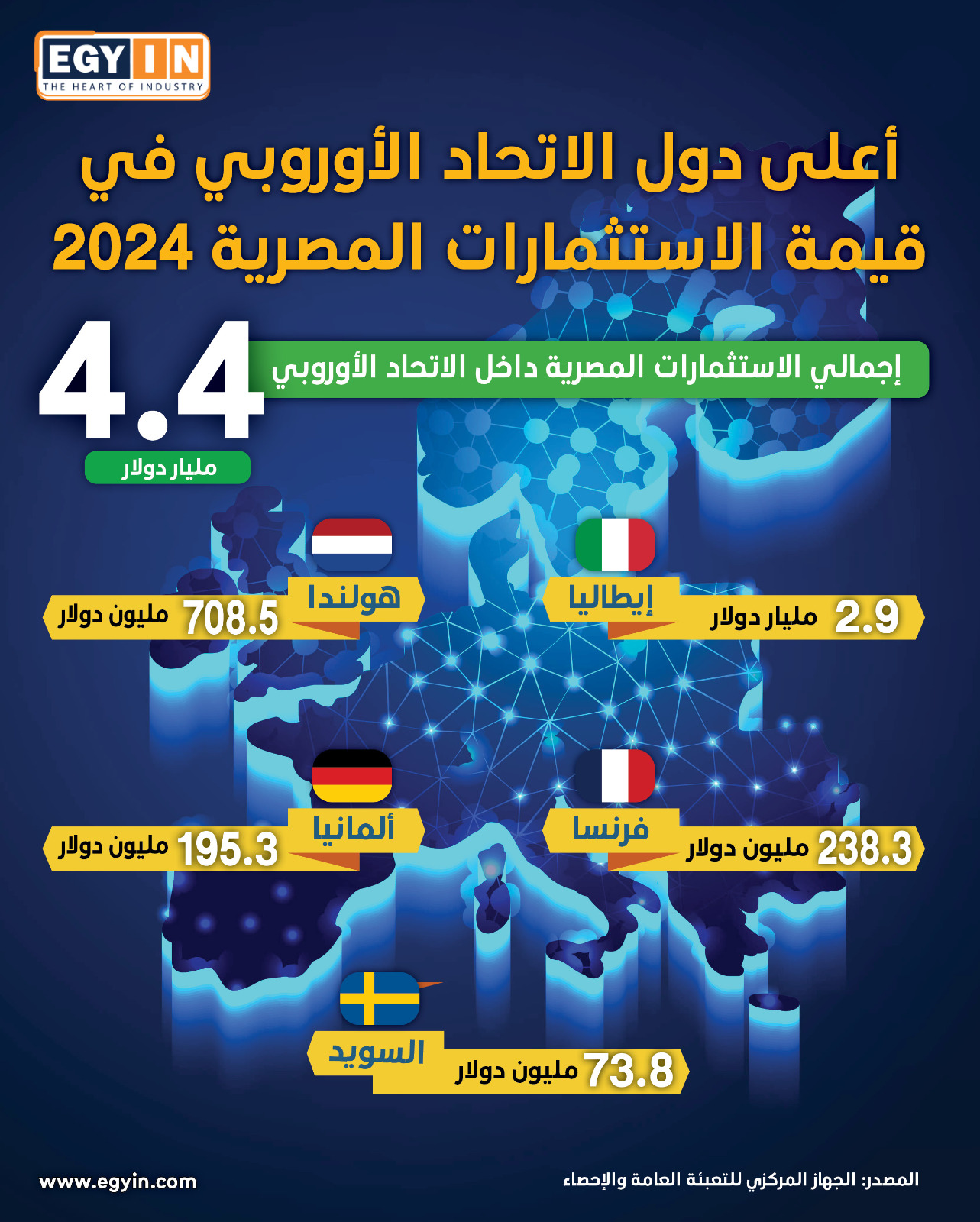 ومن خلال الانفوجراف التالي، يستعرض موقع إيجي إن، أعلى دول الاتحاد الأوروبي في قيمة الاستثمارات المصرية خلال عام 2024،