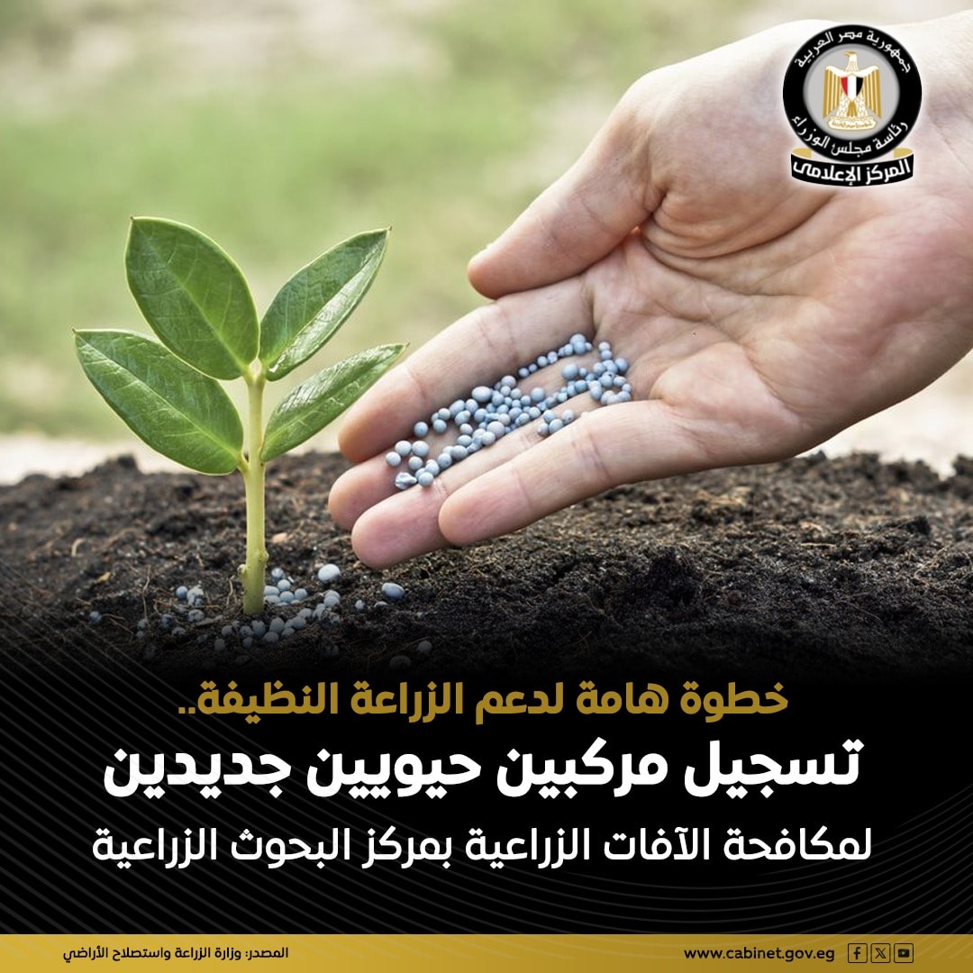 أكد المركز الإعلامي لمجلس الوزراء، أن وزارة الزراعة واستصلاح الأراضي، أعلنت عن نجاح معهد بحوث وقاية النباتات التابع لمركز البحوث الزراعية، في تسجيل مركبين حيويين جديدين لمكافحة الآفات الزراعية، بما يعزز من توطين صناعة المبيدات الحيوية.