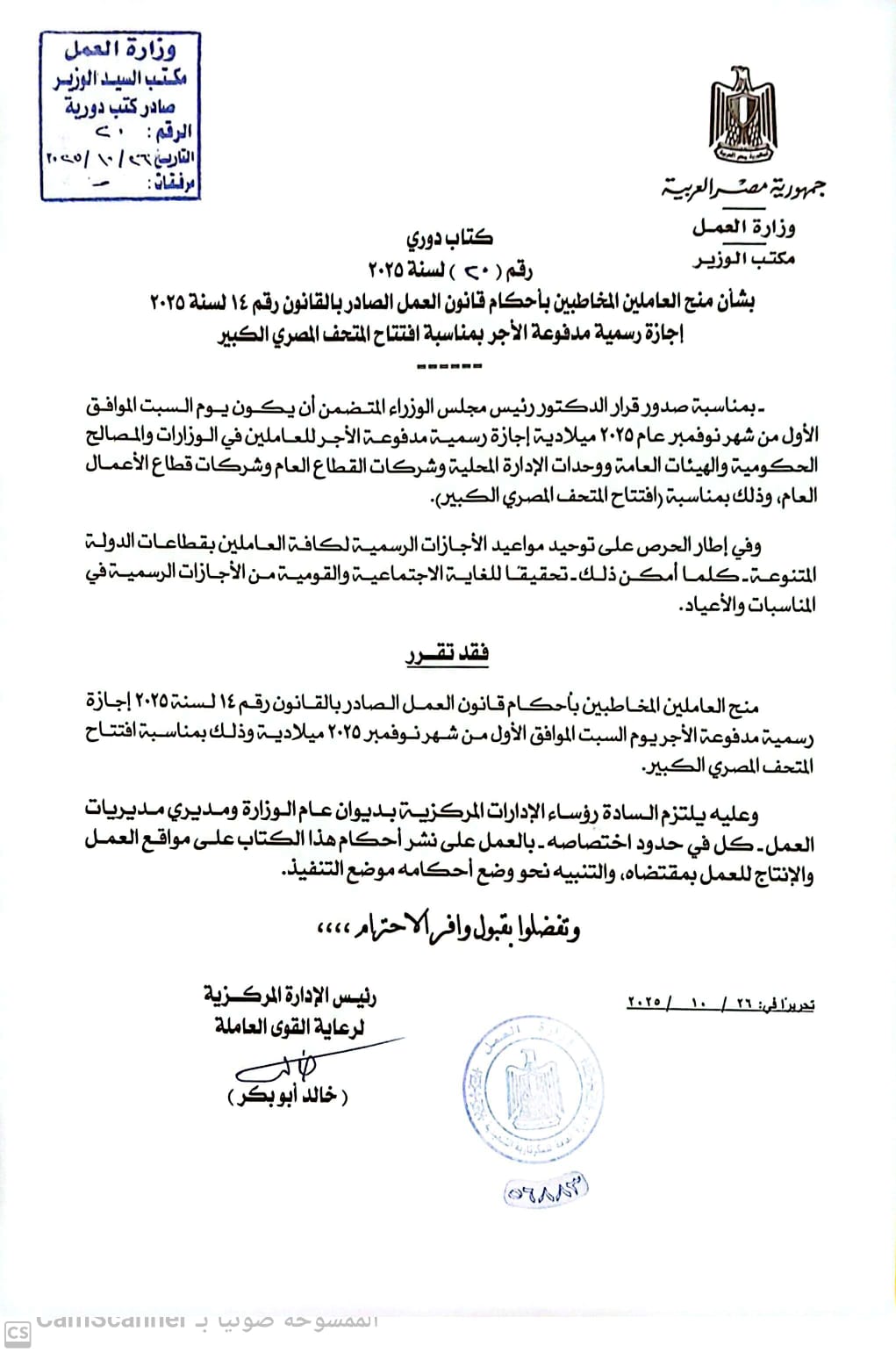 أعلن وزير العمل، محمد جبران، أن يوم السبت المقبل الموافق 1 نوفمبر 2025 سيكون إجازة رسمية مدفوعة الأجر للعاملين بالقطاع الخاص، الخاضعين لأحكام قانون العمل الصادر بالقانون رقم 14 لسنة 2025، وذلك بمناسبة افتتاح المتحف المصري الكبير.