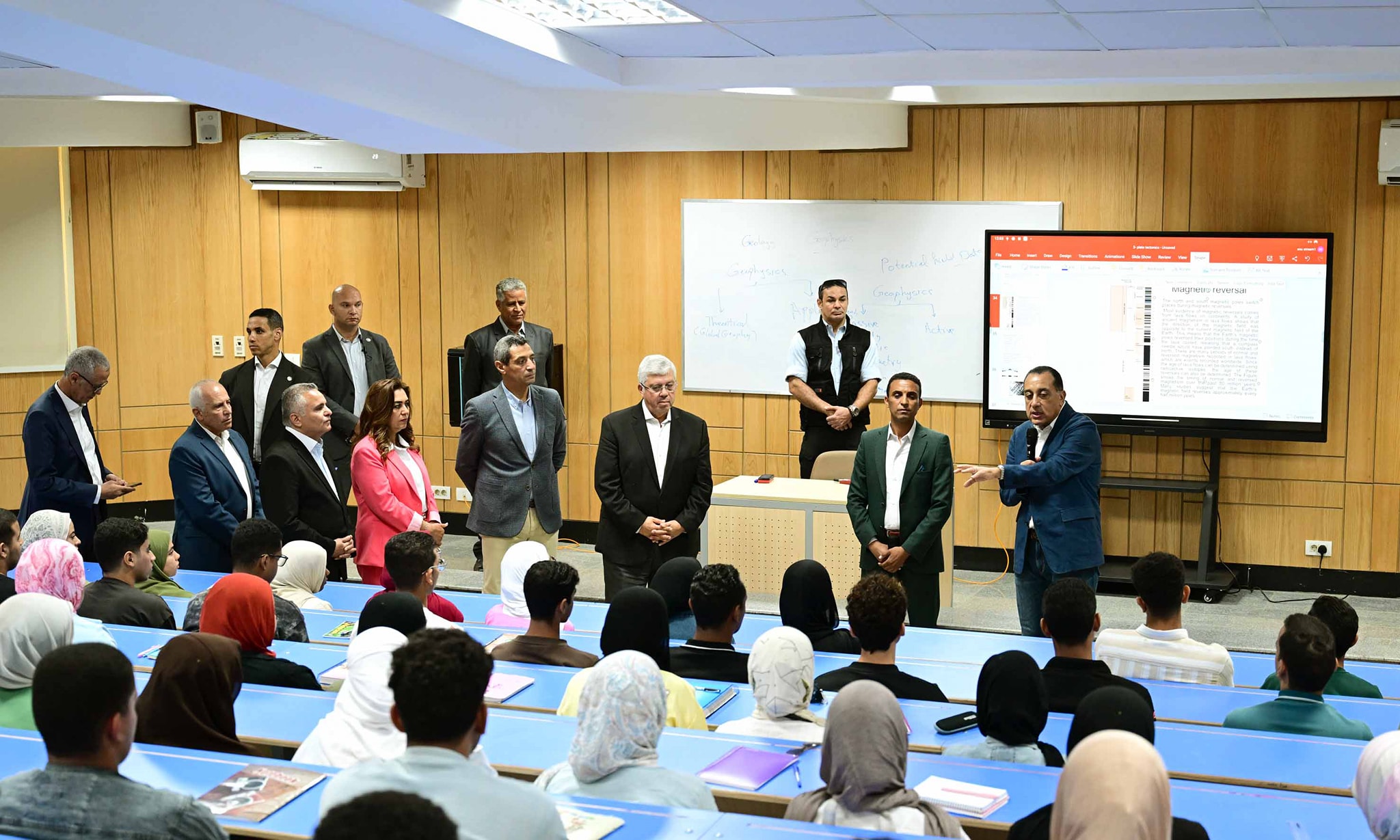 وخلال الجولة، تفقد رئيس مجلس الوزراء مدرج كلية العلوم؛وتابع جانبًا من محاضرة في الجيولوجيا لطلاب الكلية؛ وأجرى رئيس مجلس الوزراء حوارا مع عدد كبير من الطلاب، معبرا عن سعادته بتواجده اليوم مع شباب مصر في أول عام دراسي بهذه الجامعة الناشئة، قائلا: أنتم المستقبل لأننا نعمل من أجل المستقبل، فهدف الدولة هو تخريج طلاب أكفاء يواكبون متطلبات المستقبل، وقادرون على التكيف مع أحدث التقنيات التكنولوجية في مختلف المجالات.