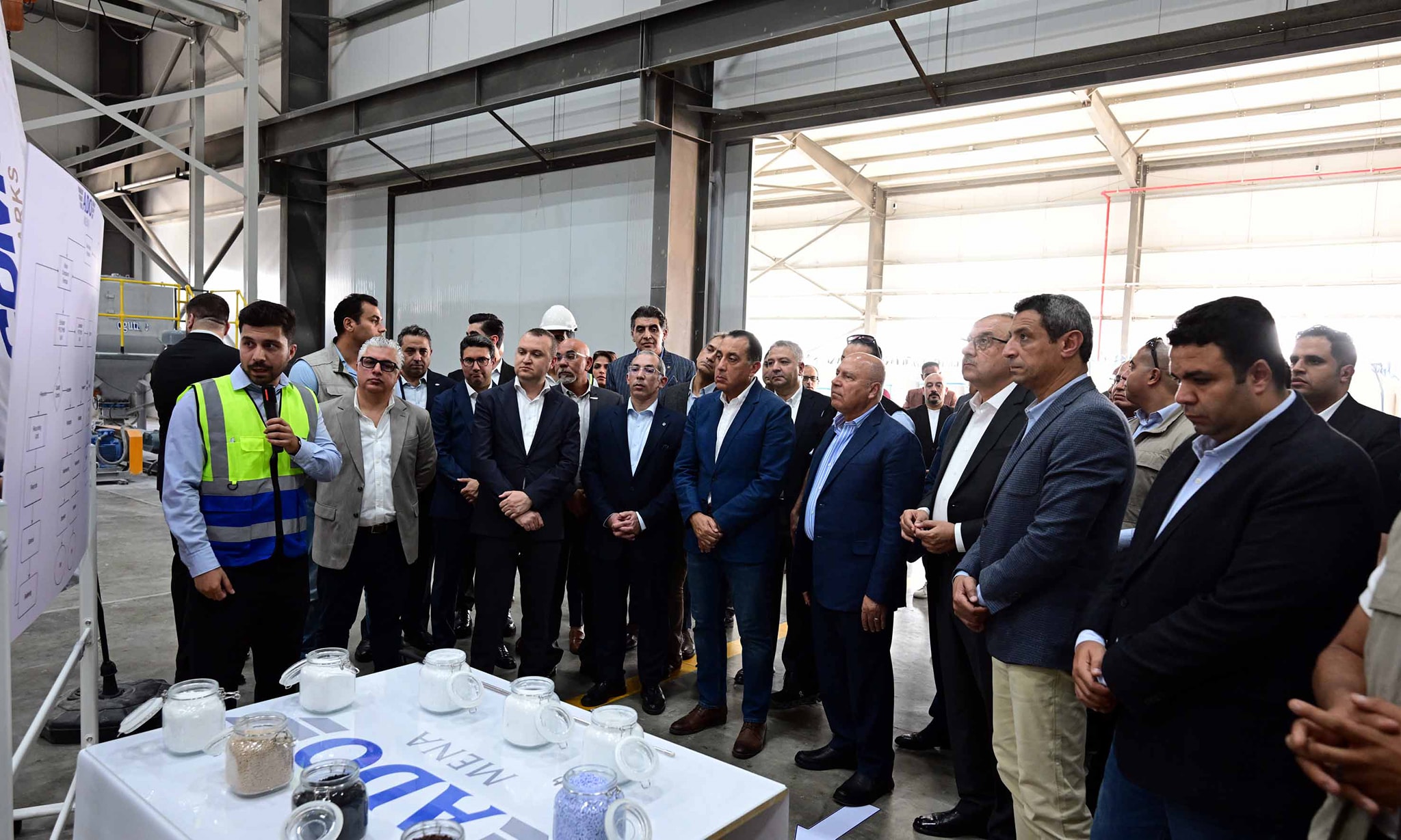 كما قام رئيس الوزراء ومرافقوه بجولة في المصنع، مصحوبًا بشرح من مسؤولي الشركة، حيث رحب إيمري إكسوي، المدير التنفيذي لمجموعة شركات أدو، برئيس الوزراء والحضور، في "مصنع أدو مينا لصناعة مواد البناء"، الذي يمثل الخطوة الأولى في خطط الشركة الاستثمارية طويلة الأجل، ويمثل التزامها بالمساهمة في تحسين دعم نمو الاقتصاد المصري، حيث يستفيد من التيسيرات المقدمة للمستثمرين، وتيسيرات التصدير، وسيكون مركزاً انتاجياً ليس فقط للسوق المحلية، وإنما لجميع أنحاء الشرق الأوسط وأفريقيا.