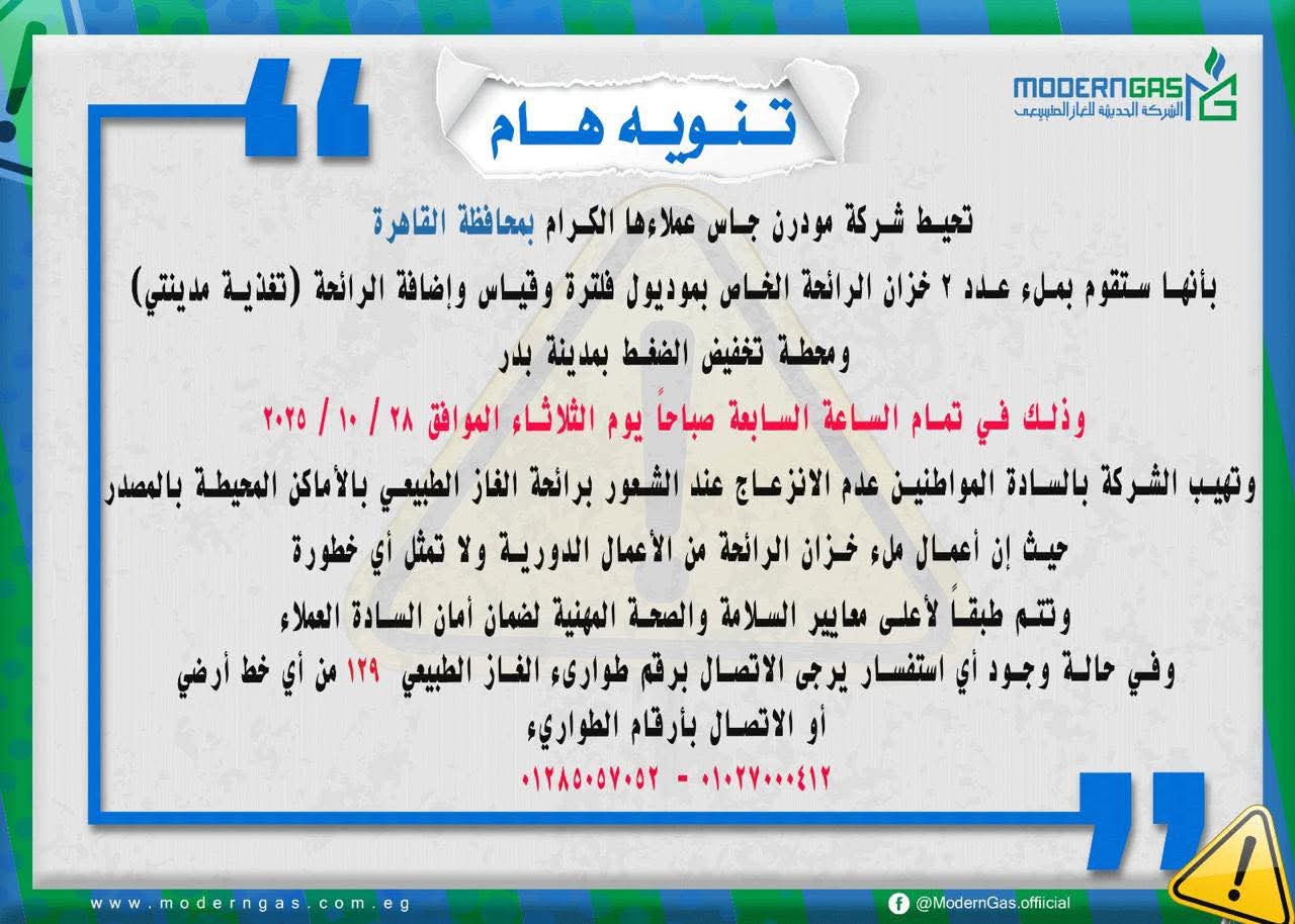 أعلنت شركة مودرن جاس، إحدى شركات قطاع البترول، أنه سيكون هناك أعمال صيانة دورية وملء عدد من خزانات الرائحة الخاصة بمنظومة الغاز الطبيعي، وذلك في نطاق محافظة القاهرة، صباح غد الثلاثاء الموافق 28 أكتوبر 2025.