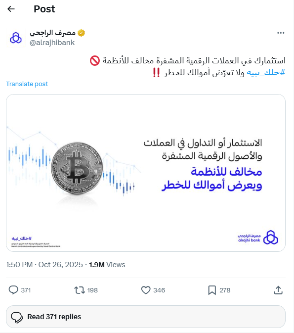 جددت مؤسسات مالية كبرى في كل من المملكة العربية السعودية ومصر تحذيراتها من الاستثمار والتعامل في العملات الرقمية المشفرة، مؤكدة أن هذه الأنشطة تنطوي على مخاطر عالية ومخالفة للأنظمة والقوانين المعمول بها، وفي هذا السياق، أكد مصرف الراجحي السعودي أن الاستثمار في هذه العملات "مخالف للأنظمة المعمول بها"، داعيًا العملاء إلى الحذر للحفاظ على أموالهم.