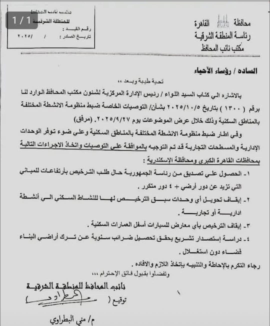 و جاء في القرار، إنه بالإشارة إلى كتاب رئيس الإدارة المركزية لشئون مكتب المحافظ الوارد برقم ( 1300 ) بتاريخ 2025/10/5 بشأن التوصيات الخاصة ضبط منظومة الأنشطة المختلفة بالمناطق السكنية وذلك خلال عرض الموضوعات يوم 2025/9/27.