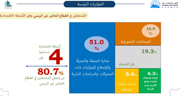 الإحصاء: تجارة الجملة والتجزئة تتصدر الأنشطة الاقتصادية بنسبة 54.4%