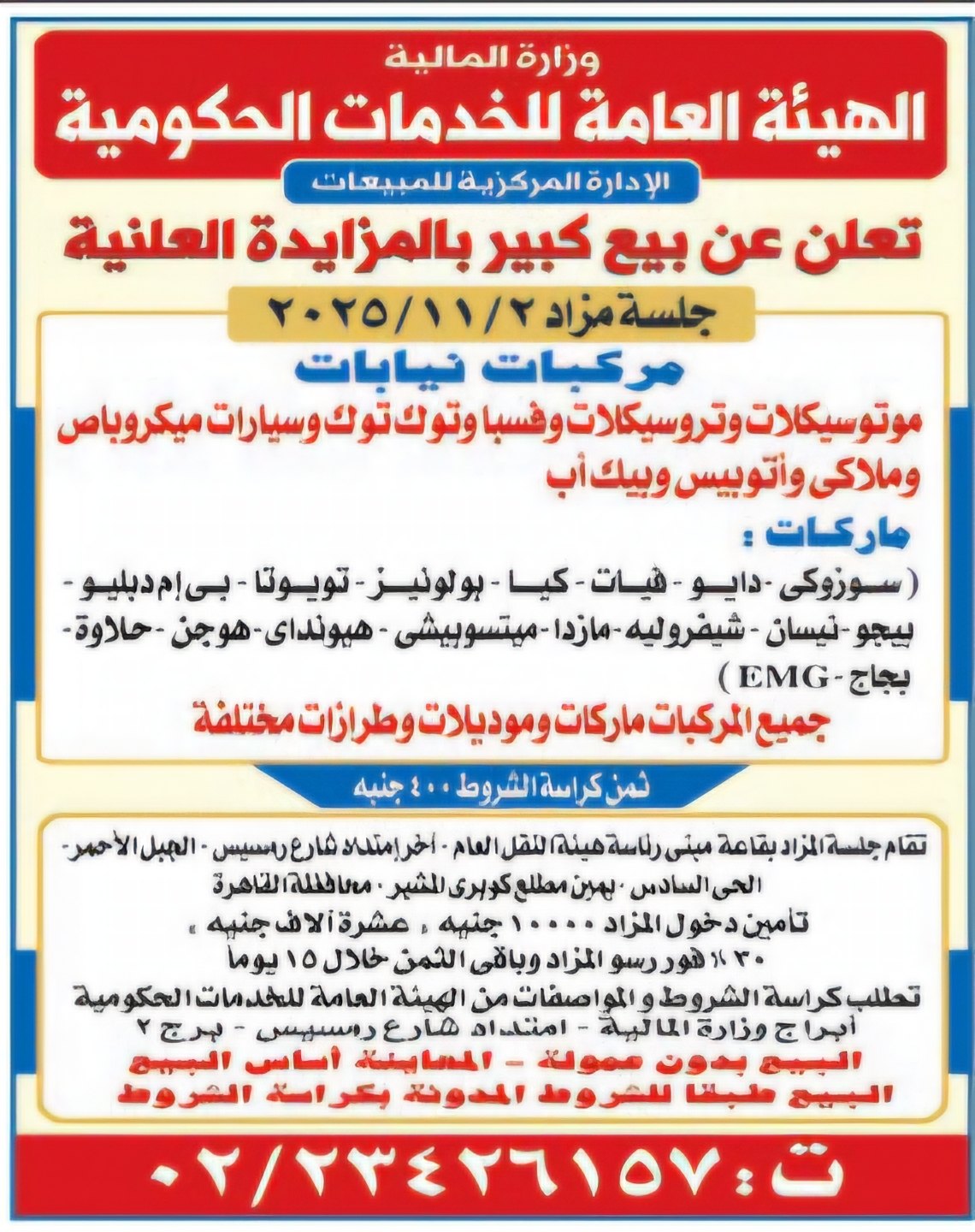 تفاصيل مزاد هيئة الخدمات الحكومية لبيع السيارات بتاريخ 2 نوفمبر 2025