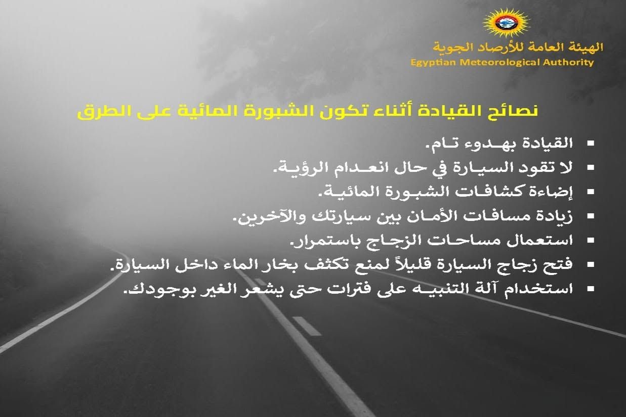 نصائح الهيئة العامة للأرصاد الجوية للقيادة أثناء تكون الشبورة المائية على الطرق:-