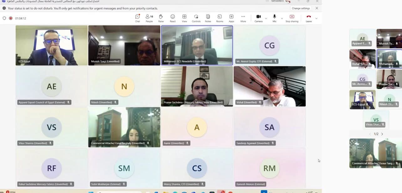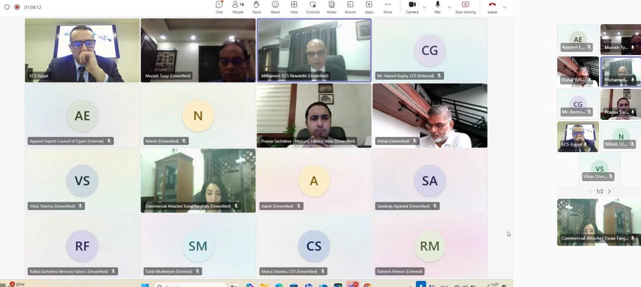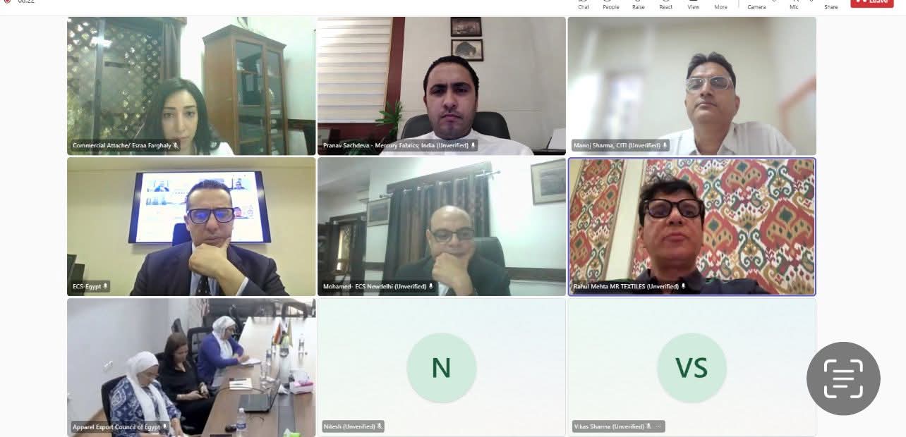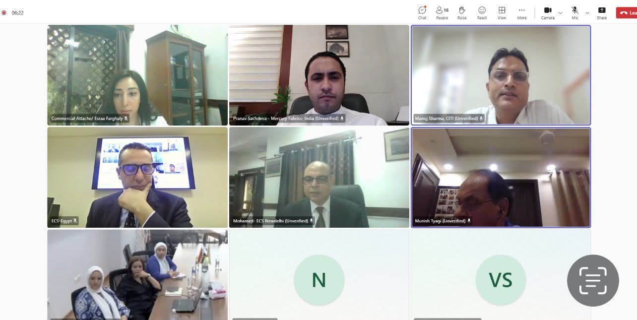 نظم مكتب التمثيل التجاري في نيودلهي برئاسة المستشار التجاري محمد عبد المجيد، لقاءً افتراضيًا حول صناعة المنسوجات والملابس الجاهزة، بمشاركة 10 من كبريات الشركات الهندية العاملة في القطاع، إلى جانب اتحاد صناعة النسيج الهندية (CITI)، وذلك بالتنسيق مع شئون الترويج بالاستثمار بجهاز التمثيل التجاري المصري، والمجلس التصديري للملابس الجاهزة و التصديري للمنسوجات.