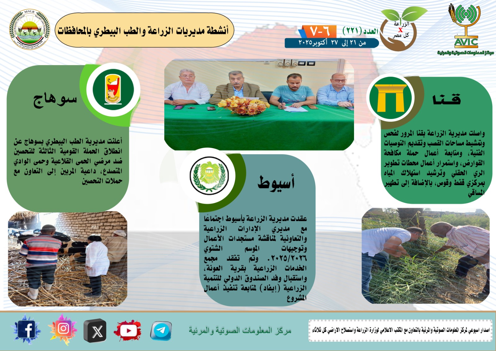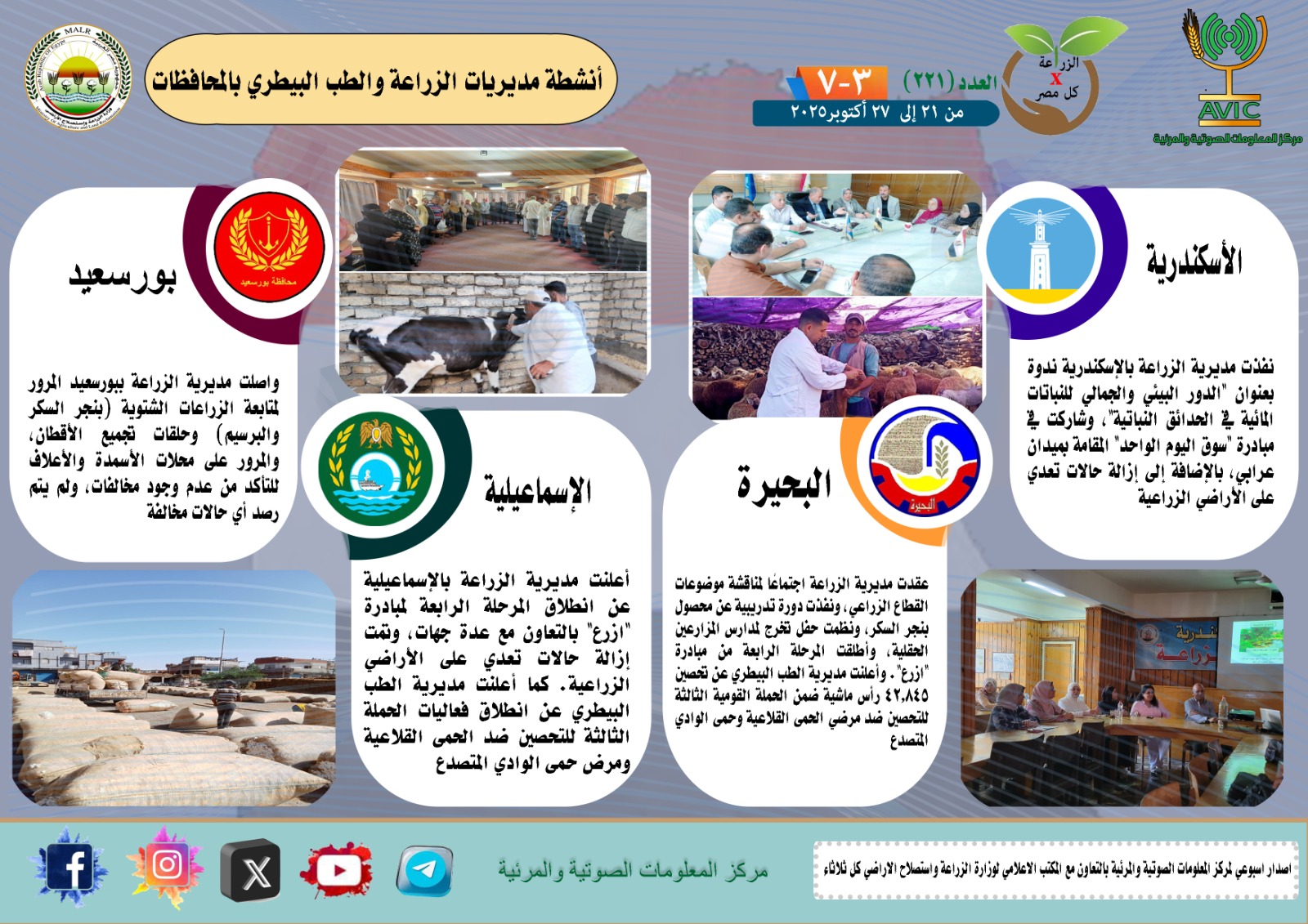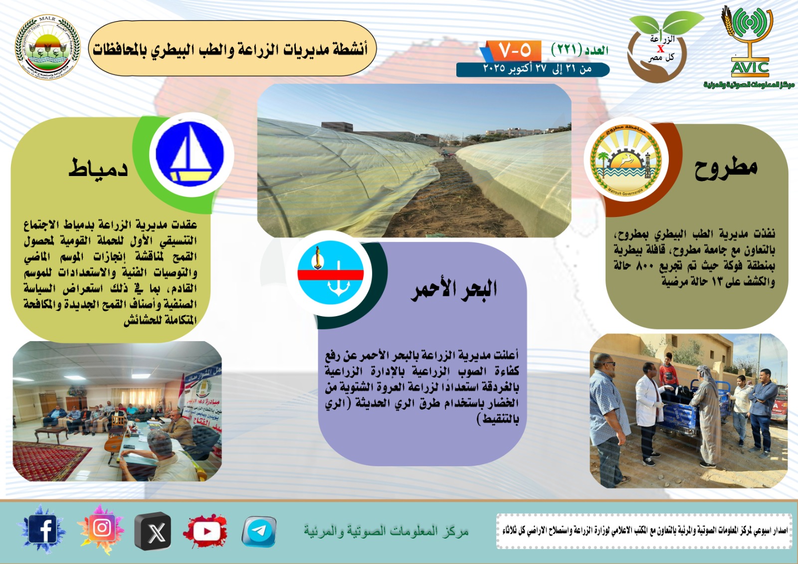 أصدر مركز المعلومات الصوتية والمرئية التابع لوزارة الزراعة واستصلاح الأراضي، العدد 221 من إصدار "الزراعة في كل مصر"، والذي يتناول أبرز الجهود التي نفذتها مديريات الزراعة والطب البيطري على مستوى الجمهورية خلال الفترة من 21 إلى 27 أكتوبر الجاري، كما يبرز الأنشطة الرقابية والتحصينات البيطرية والمبادرات الزراعية المتنوعة في محافظات مصر.