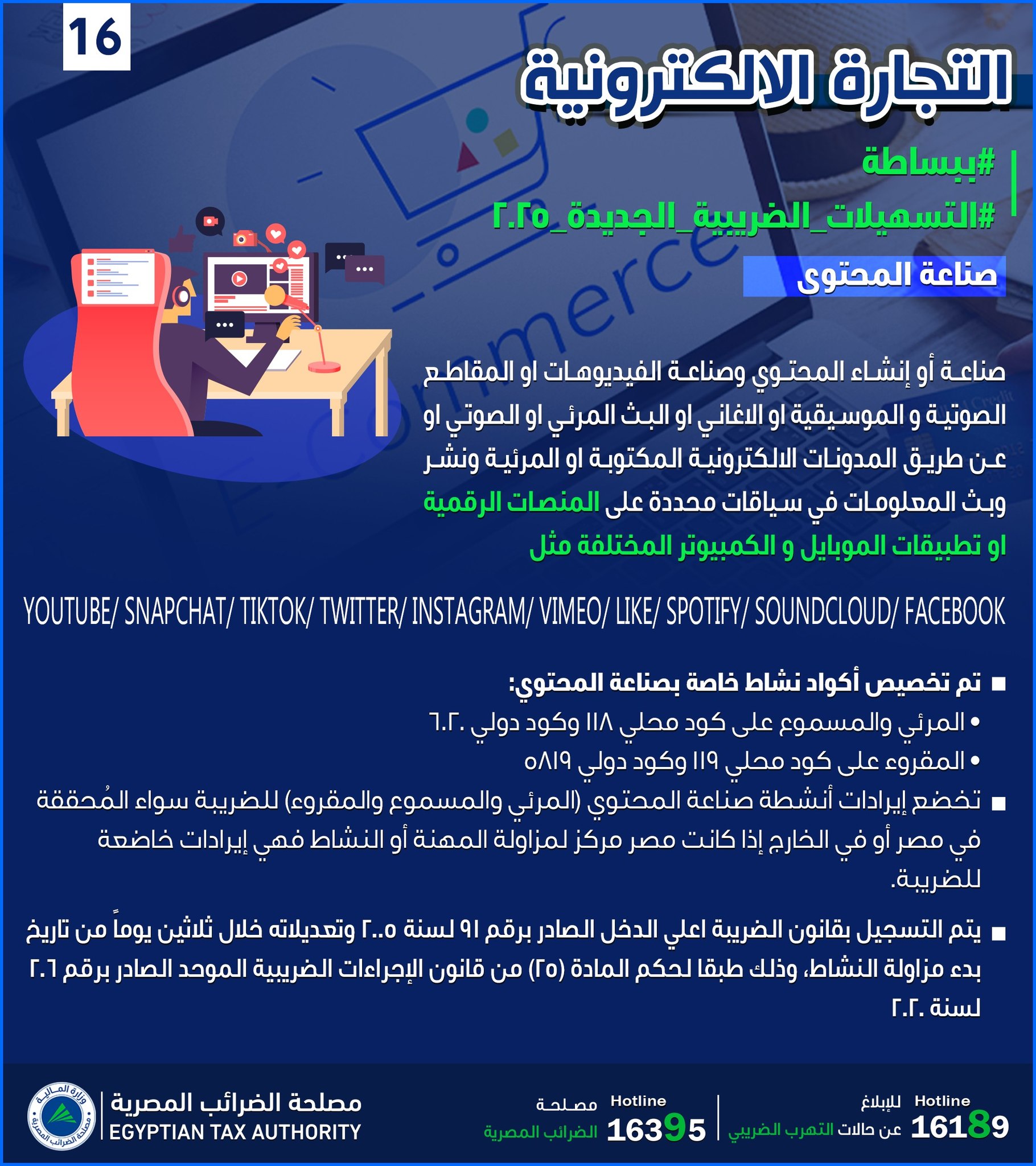 وأوضحت مصلحة الضرائب أن صناعة المحتوى تشمل إنشاء الفيديوهات أو المقاطع الصوتية والموسيقية أو الأغاني أو البث المرئي، أو الصوتي أو المدونات الإلكترونية، سواء كانت موجهة للتثقيف أو الترفيه، ويتم نشرها عبر المنصات الرقمية أو تطبيقات الهواتف والكمبيوتر المختلفة، مثل: YouTube/ Snapchat/ TikTok/ Twitter/ Instagram/ Vimeo/ like/ Spotify/ SoundCloud/ Facebook.