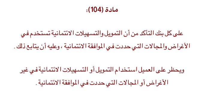 وتنص مادة رقم 104 على: كل بنك التأكد من أن التمويل والتسهيلات الائتمانية تستخدم في الأغراض والمجالات التي حددت في الموافقة الائتمانية، وعليه أن يتابع ذلك، ويحظر على العميل استخدام التمويل أو التسهيلات الائتمانية في غير الأغراض أو المجالات التي حددت في الموافقة الائتمانية.