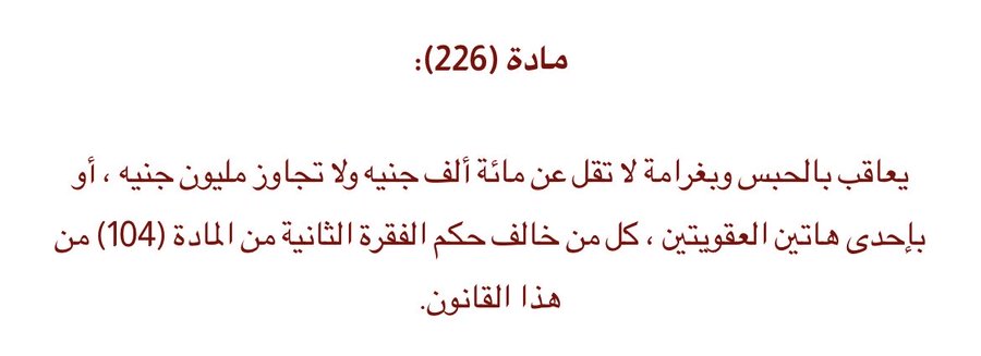 وتنص المادة رقم 226 على: يعاقب بالحبس وبغرامة لا تقل عن مائة ألف جنيه ولا تجاوز مليون جنيه، أو بإحدى هاتين العقوبتين، كل من خالف حكم الفقرة الثانية من المادة (104) من القانون، ويعاقب بغرامة لا تقل عن عشرة آلاف جنيه ولا تجاوز مائة ألف جنيه كل من خالف حكم المادة (59) من هذا القانون فيما يتعلق بإهانة أو تشوبه النقد.