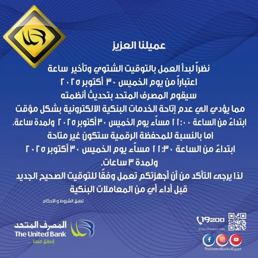 كما أعلن المصرف المتحد، إيقاف بعض الخدمات، وذلك وفقاً لإجراء بعض التحديثات على الأنظمة التشغيلية، نظرًا لقرب العمل بالتوقيت الشتوي مساء يوم الخميس الموافق 30 أكتوبر 2025 الساعة 11، وتكون التحديثات بدءًا من الساعة 11:30 مساء ولمدة ثلاث ساعات تقريبًا، مما يؤثر على الخدمات المقدمة خلال فترة التحديث.