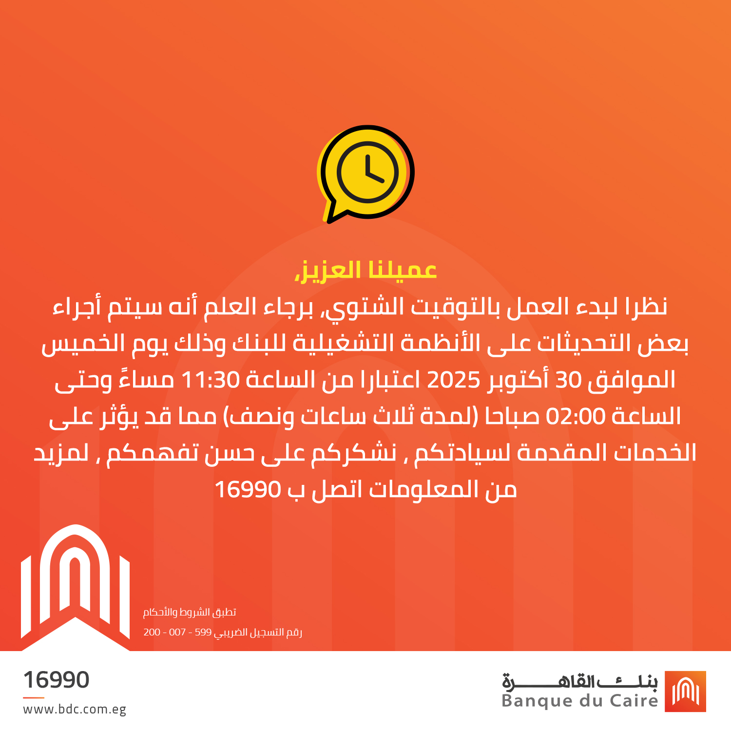 تعطلت خدمات بنك القاهرة، بشكل مؤقت بسبب التحديثات التقنية المرتبطة بالتحول إلى التوقيت الشتوي، حيث تستمر فترة تعطل الخدمات حتى الساعة 02:00 صباحًا لمدة ثلاث ساعات ونصف، مما قد يؤثر على الخدمات المقدمة.