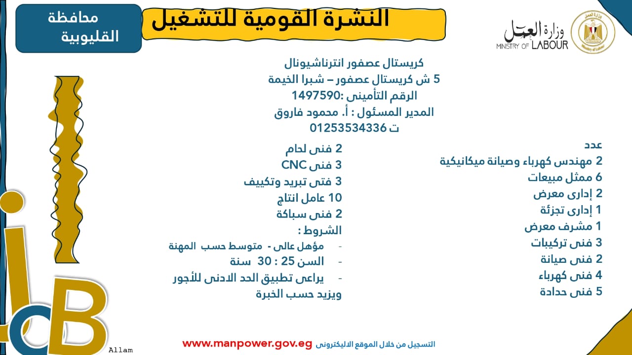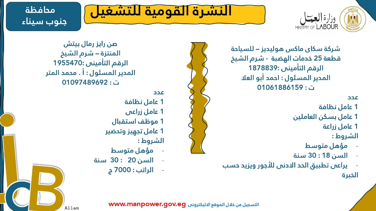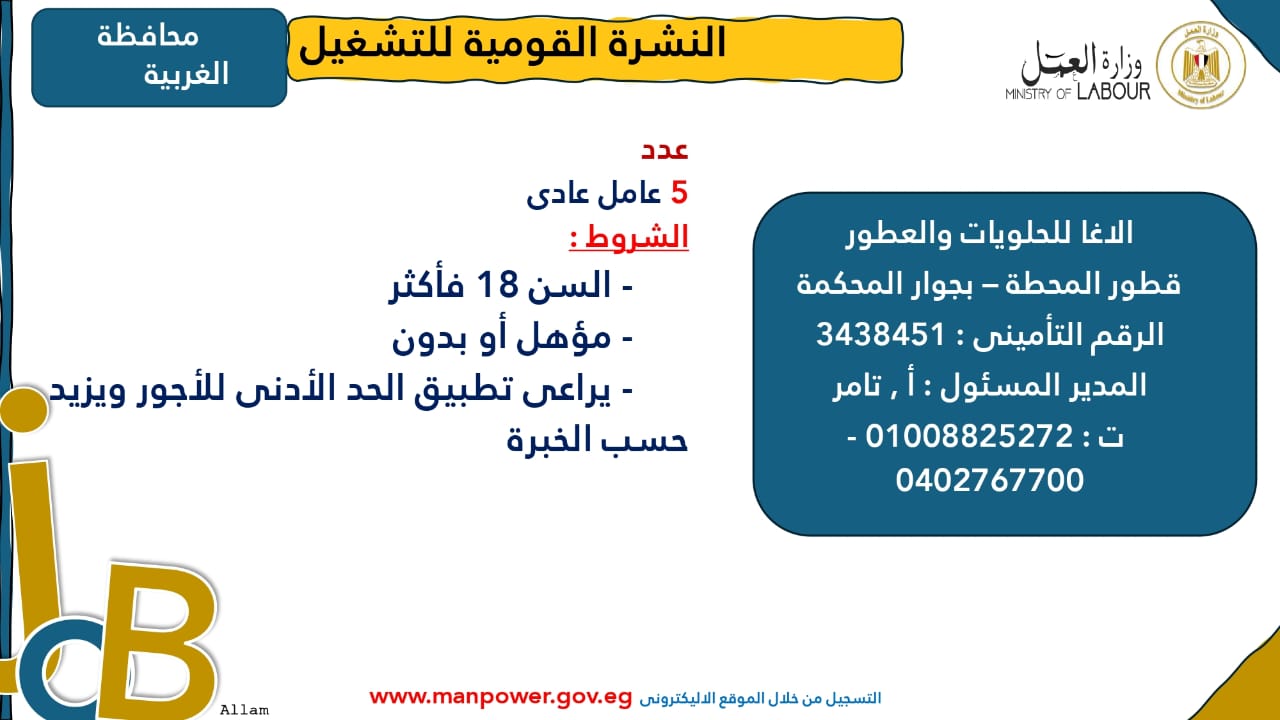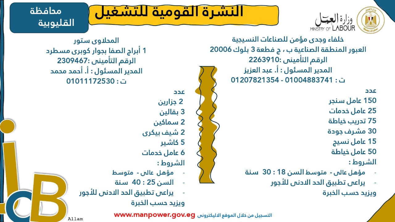 وبيّنت الوزارة أن التقديم على هذه الفرص الجديدة يتم خلال شهر نوفمبر 2025، من خلال الإدارة العامة للتشغيل بمقر الوزارة القديم بمدينة نصر، أو عبر مديريات العمل في المحافظات، كما يمكن التقديم مباشرةً من خلال بيانات الشركات المرفقة بالنشرة، أو عبر الموقع الرسمي لوزارة العمل على شبكة الإنترنت.