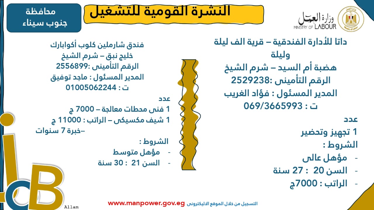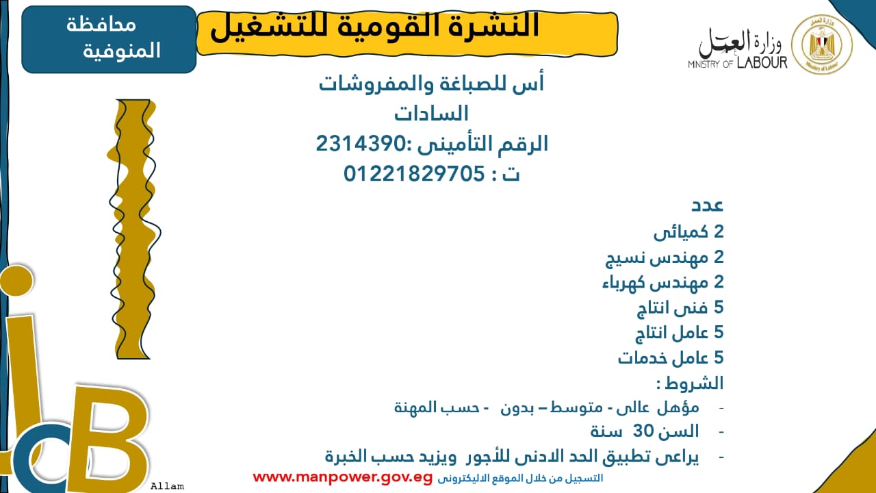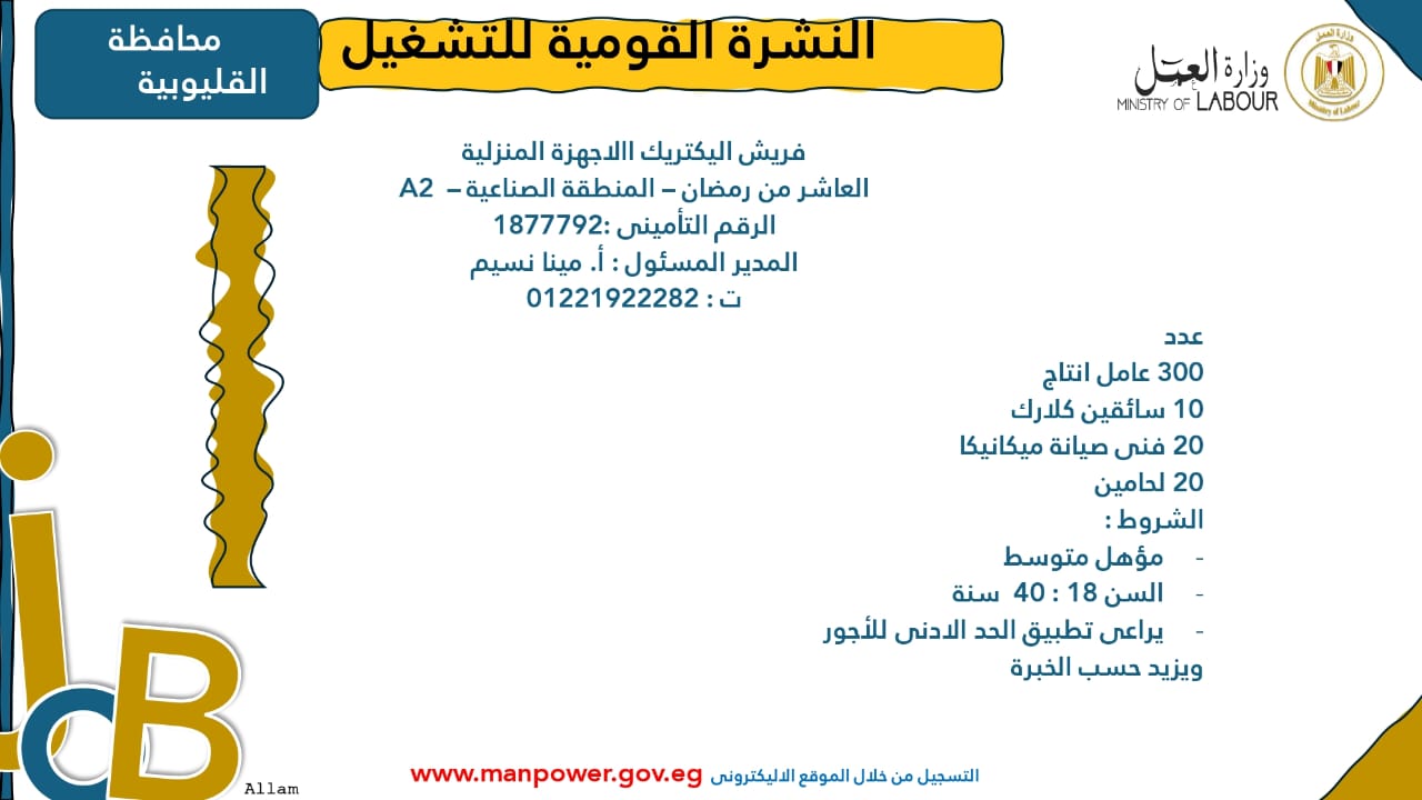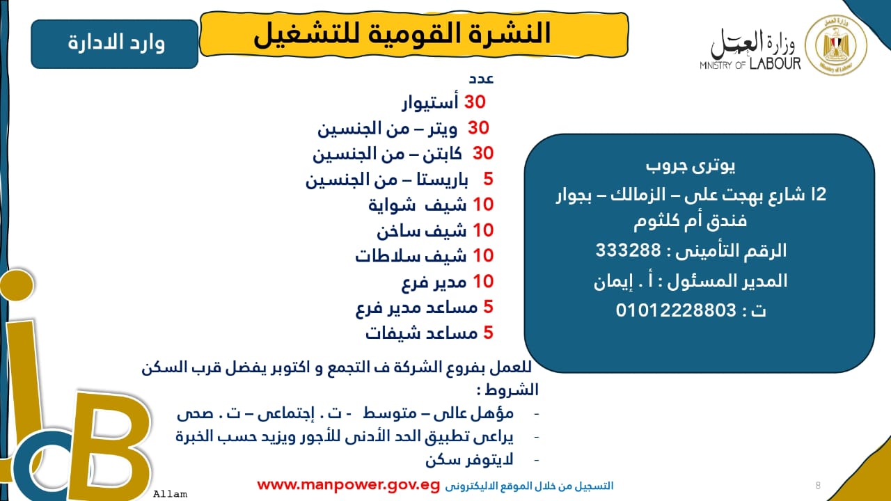 وبيّنت الوزارة أن التقديم على هذه الفرص الجديدة يتم خلال شهر نوفمبر 2025، من خلال الإدارة العامة للتشغيل بمقر الوزارة القديم بمدينة نصر، أو عبر مديريات العمل في المحافظات، كما يمكن التقديم مباشرةً من خلال بيانات الشركات المرفقة بالنشرة، أو عبر الموقع الرسمي لوزارة العمل على شبكة الإنترنت.