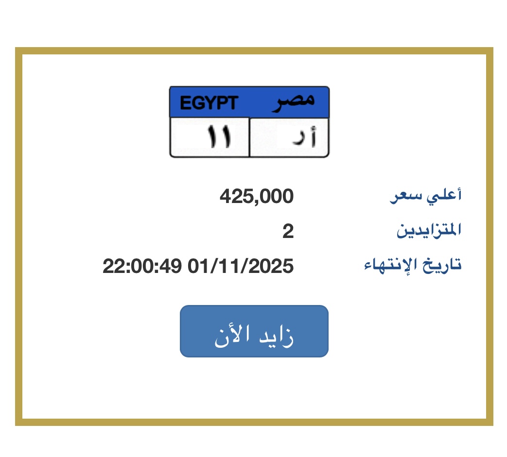 تحظى اللوحة الخاصة «أ ر 11» بإقبال متزايد بين هواة لوحات السيارات النادرة في مصر، ويتوقع أن يسجل السعر النهائي رقماً قياسياً إذا دخل مزايدون آخرون في المنافسة.