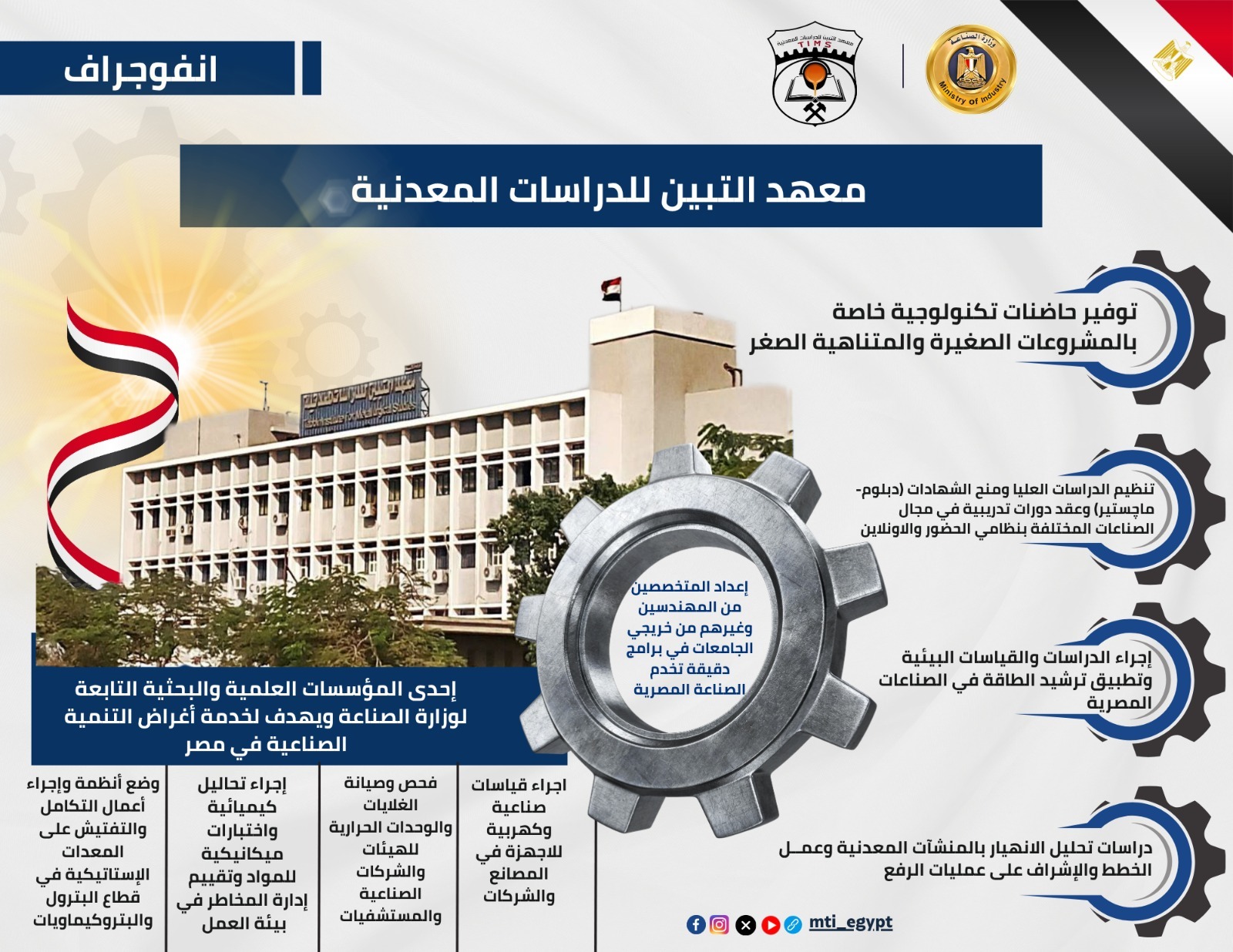 يعتبر معهد التبين للدراسات المعدنية إحدى المؤسسات العلمية والبحثية التابعة لوزارة الصناعة ويهدف لخدمة أغراض التنمية الصناعية في مصر، وإعداد المتخصصين من المهندسين وغيرهم من خريجي الجامعات في برامج دقيقة تخدم الصناعة المصرية، ونقل العلوم والتكنولوجيات الحديثة للصناعة الوطنية لتعزيز تنافسية المنتج المصري داخلياً وخارجياً.