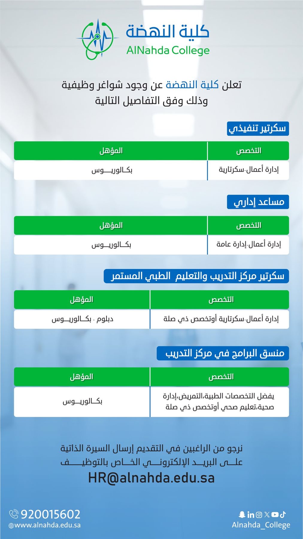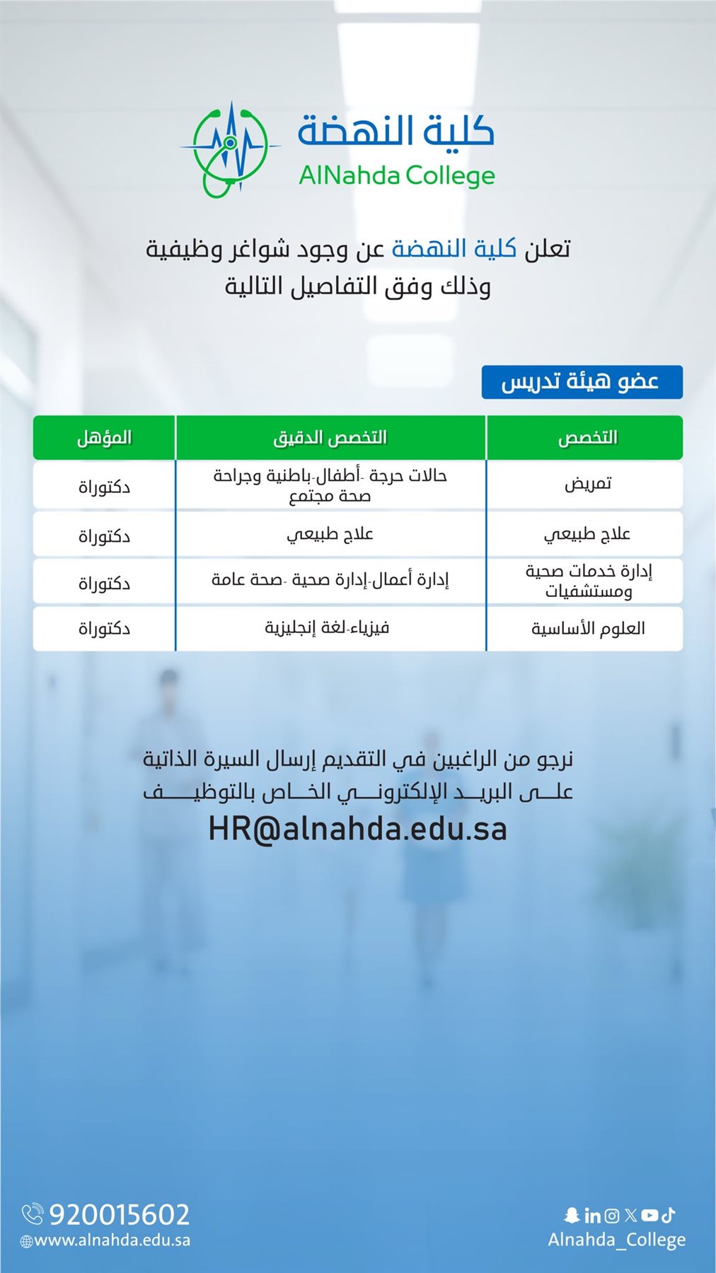 كلية النهضة بالرياض تعلن عن وظائف أكاديمية وإدارية في عدد من التخصصات