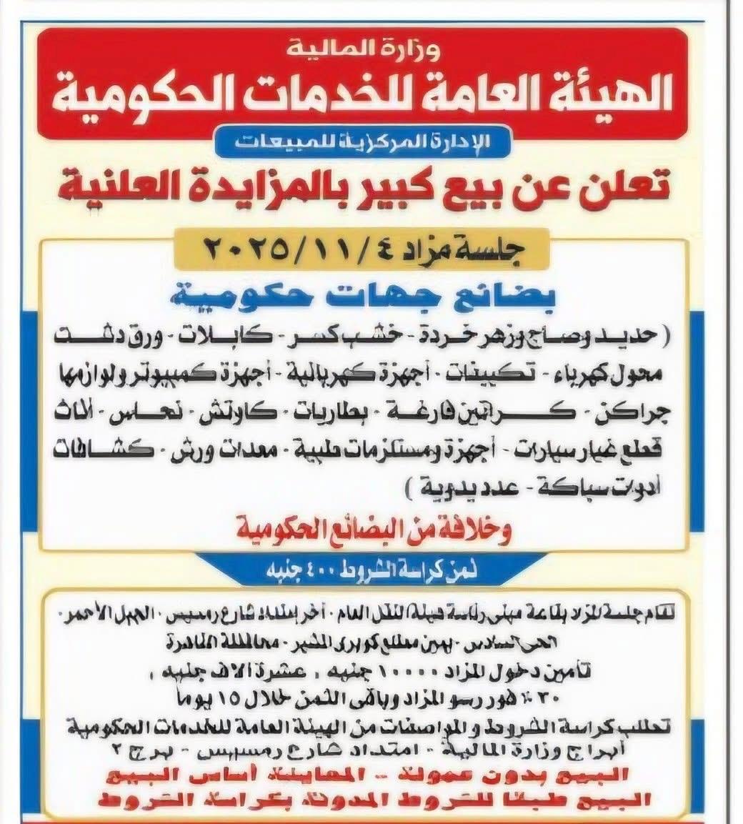 أعلنت هيئة الخدمات الحكومية عن تنظيم جلسة مزاد علني يوم الثلاثاء 4 نوفمبر 2025، لبيع مجموعة من البضائع التابعة لعدة جهات حكومية.