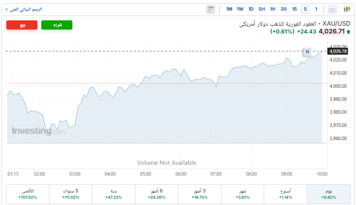 كما صعدت الأسعار الفورية للذهب بنسبة 0.6% لتتداول حاليًا عند 4026 دولارًا للأوقية، بعد أن سجلت أدنى مستوى عند 3962 دولارًا وأعلى مستوى عند 4027 دولارًا، بحسب تقرير موقع «إنفيستينج».