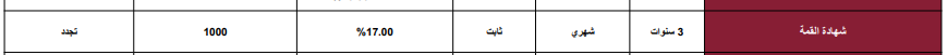 وتصدر الشهادة للأفراد الطبيعيين فقط، لمدة 3 سنوات، بمعدل عائد متغير يصرف كل شهر، يمكن استرداد قيمة الشهادة أو جزء منها بعد مرور 6 أشهر من تاريخ اصدار الشهادة.