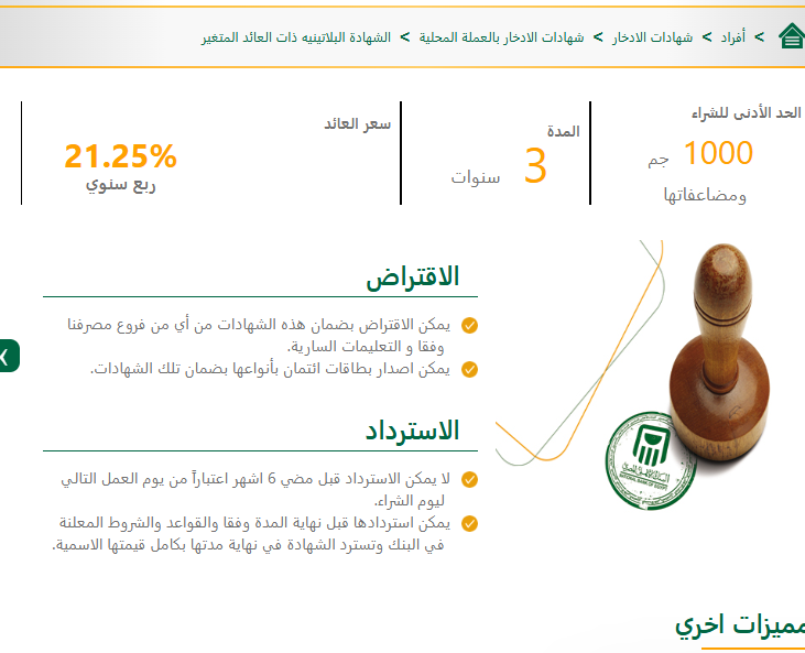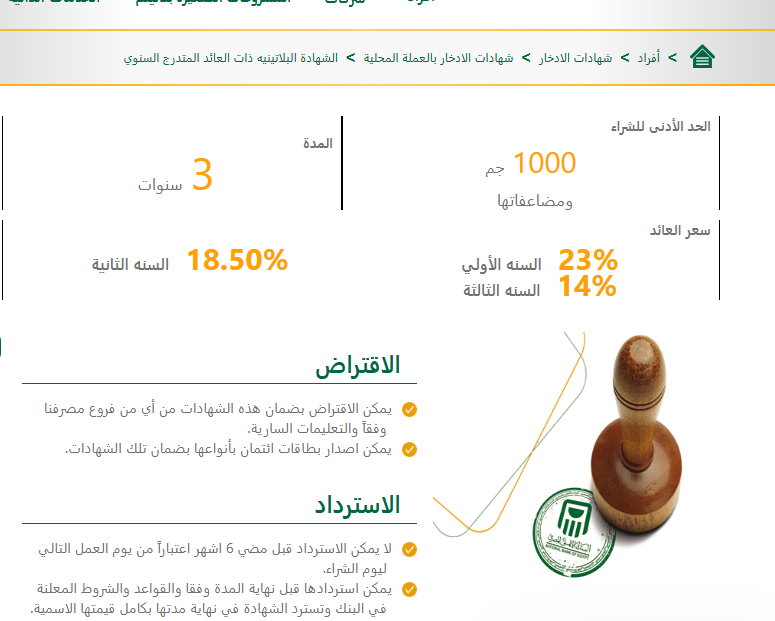 ويصل الحد الأدنى للشراء إلى 1,000 جنيه ومضاعفاتها، ولمدة 3 سنوات، وسعر العائد حاليًا في السنة الأولي، يصل إلى 23% وفي السنة الثانية 18.50% وفي السنة الثالثة 14%.