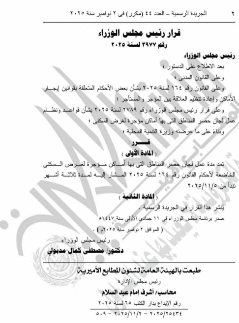 يشار إلى أن رئيس مجلس الوزراء، الدكتور مصطفى مدبولي، أصدر قرارًا بتمديد مدة عمل لجان حصر المناطق التي تحتوي على أماكن مؤجرة لأغراض سكنية، والتي تخضع لأحكام القانون رقم 164 لسنة 2025، لمدة ثلاثة أشهر إضافية تبدأ من 5 نوفمبر 2025.