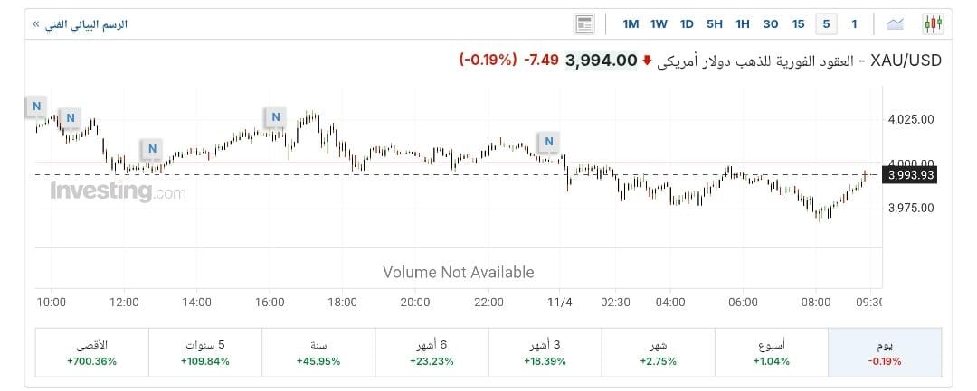 وانخفضت عقود الذهب الآجلة تسليم ديسمبر بنسبة 0.3%، لتسجل نحو 4002.20 دولارًا للأوقية، بعدما افتتحت تداولات اليوم عند المستوى 4,013.70 دولارًا للأوقية، وفقًا لـ«ياهو فايننس»، كما تراجعت الأسعار الفورية للذهب بنسبة 0.2% لتتداول حاليًا عند 3994 دولارًا للأوقية، بعد أن سجلت أدنى مستوى عند 3967 دولارًا وأعلى مستوى عند 4005 دولارًا، بحسب تقرير موقع «إنفيستينج».