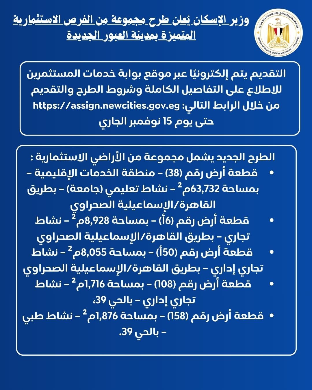 وأوضح المهندس محمود مراد، رئيس جهاز تنمية مدينة العبور الجديدة، أن الطرح الجديد يشمل مجموعة من الأراضي الاستثمارية المميزة على النحو التالي: قطعة أرض رقم (38) – منطقة الخدمات الإقليمية – بمساحة 63,732م² – نشاط تعليمي (جامعة) – بطريق القاهرة -الإسماعيلية الصحراوي، وقطعة أرض رقم (6أ) – بمساحة 8,928م² – نشاط تجاري – بطريق القاهرة-الإسماعيلية الصحراوي، وقطعة أرض رقم (50أ) – بمساحة 8,055م² – نشاط تجاري إداري – بطريق القاهرة-الإسماعيلية الصحراوي، وقطعة أرض رقم (108) – بمساحة 1,716م² – نشاط تجاري إداري – بالحي 39، وقطعة أرض رقم (158) – بمساحة 1,876م² – نشاط طبي – بالحي 39.